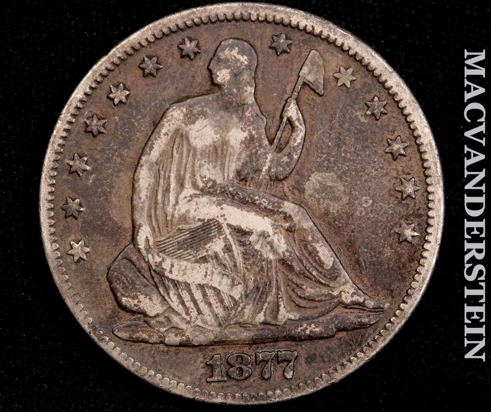 1877 Seated Half-Obv-48.00.jpg 1877 Seated Half-Obv-48.00.jpg I have suspictions about this 1877 half. It just doesn't look right to me for some reason I can't explain. The color is off, but I have seen other seated halfs that look the same. Do you see anything wrong with this coin and what do you think the grade would be ?