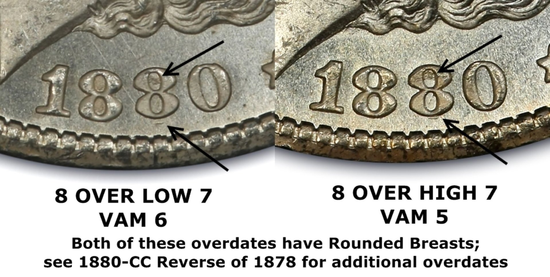 Well, the 80/79 has no dash under the 8, so that's obviously eliminated first-off. VAM-6 is eliminated by the closeness of the dash. The other 6 known VAMs, though, are still in the mix until clearer images and the reverse are presented. I'd like to say I see the stuff in and above the upper loop of the second 8, which would narrow things down to VAM-5, but the image isn't sharp enough for me to be sure. Even in these images, also, the characteristic die scratch off the first U in UNUM ought to be somewhat noticeable.