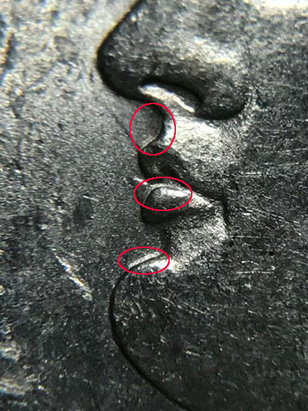 *shriek* Clashing in and of itself is too common on Morgans to really be "proof" of much, even with a little rotation added. However, this one sure appears to be counterclashed, where a second clashing incident (I'm thinking they're consecutive press movements) retransferred - in this case - clashed details of the lips back onto the obverse. These specific locations are not so easily duplicable, and almost definitive for 50A. The chance exists, though, so reverse markers should be confirmed also.