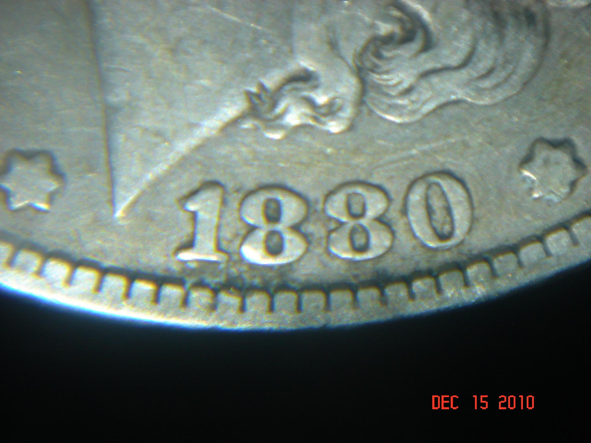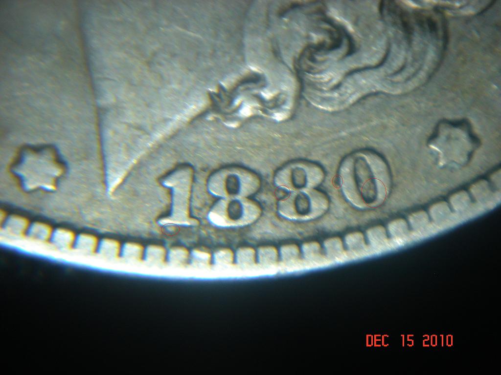 I was glancing through some scrap morgans that i picked up today, and happen to notice this one! Is this some sort of over date? It's an 1880-O and it looks like the zero has a 7 behind it, and the second 8 looks like there was a zero behind it? and finally the 1 has some kind of nub at the bottom of it??? Anyone have any ideas as to what it may be? And if you know what VAM it may be if it is an error that would help! Also not sure if this has anything to do with it, but the O mint mark is either small or medium. Here's the pics: Area of questions are circled in the hard to see red circles... No circles Mint mark on the 1880-O Here's the O mint mark on an 1897-O