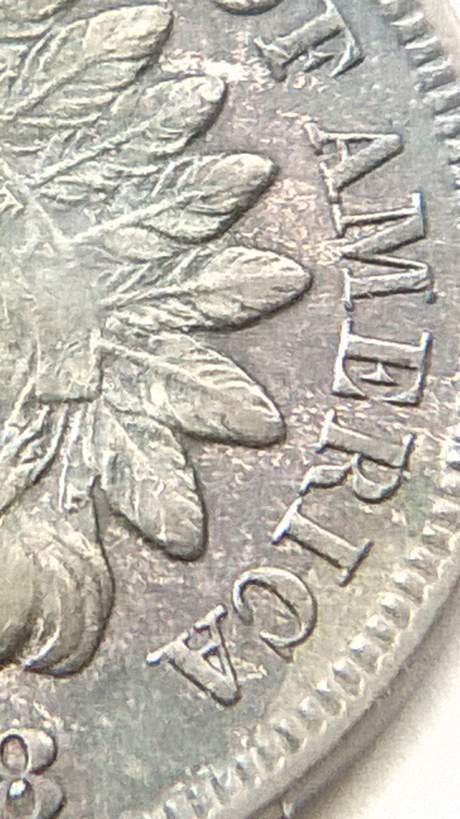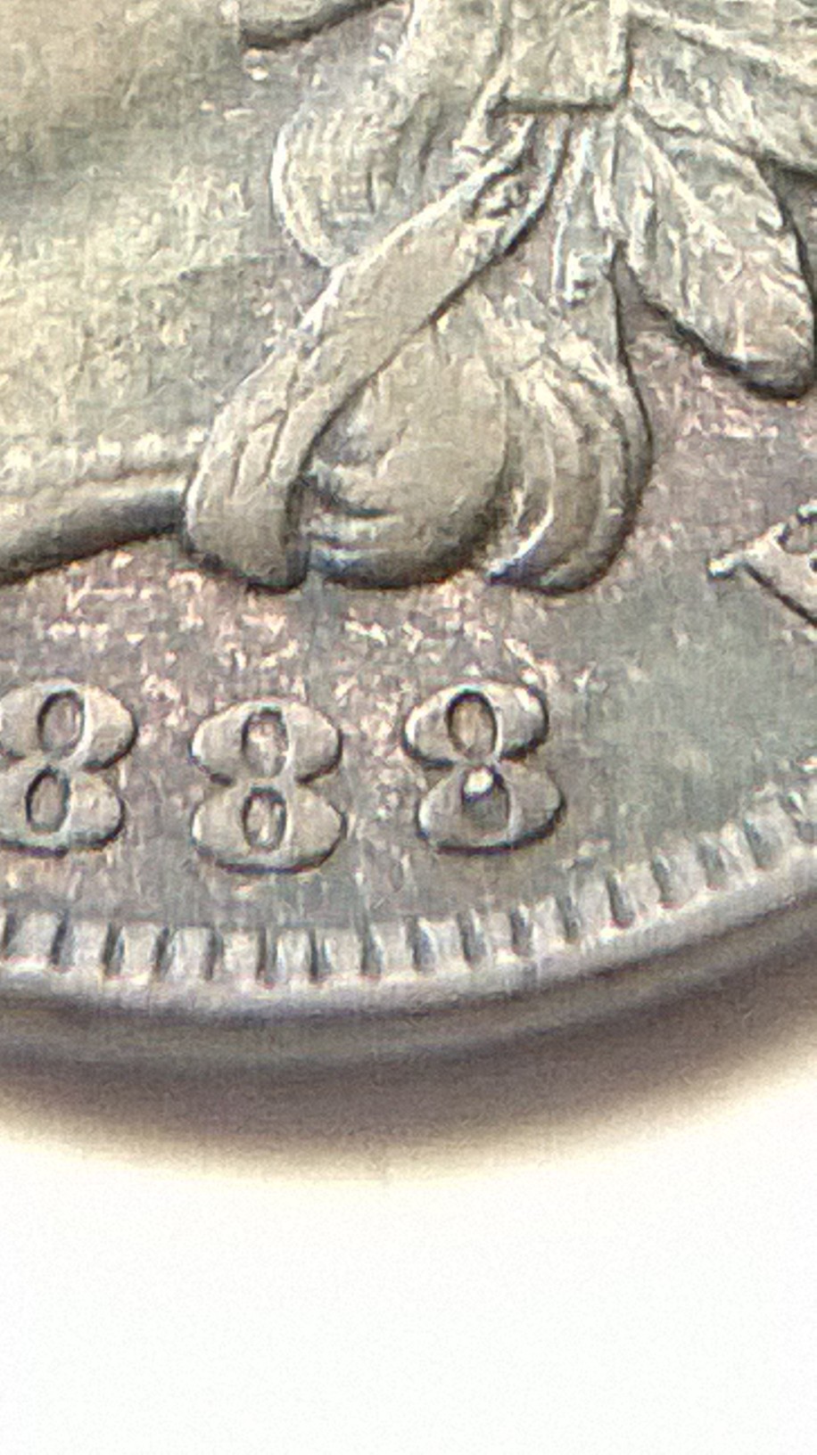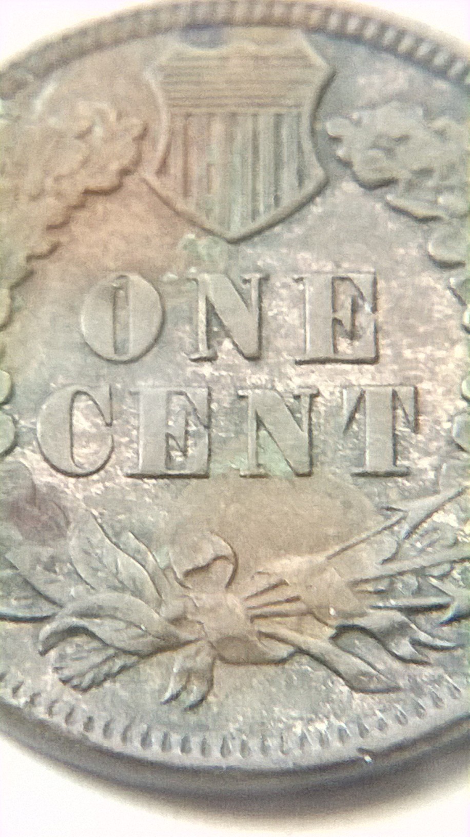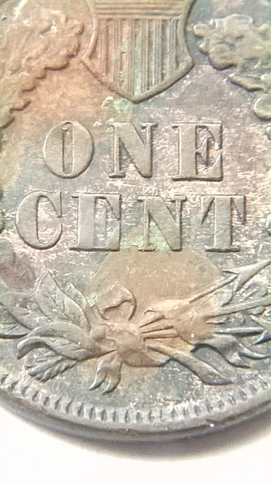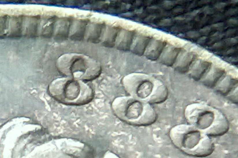 this is what i see under 10x loop on obv of IHC in date the last 8 show minor details of cross bar of (7) on top portion of 8 and the lower bar of 7 just below the bottom of loopin 8 just of center to the left you notice the piece of? in center of 8 i do not want to remove it to see if the center portion of 7 is present inside, last feather CA ? some other minor looks doubling feathers, REVERSE: shield? minor doubling beautiful natural tones either way nice find?