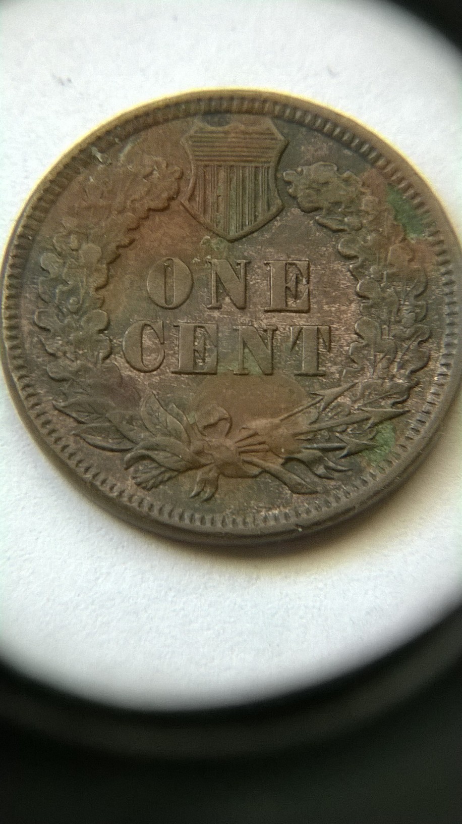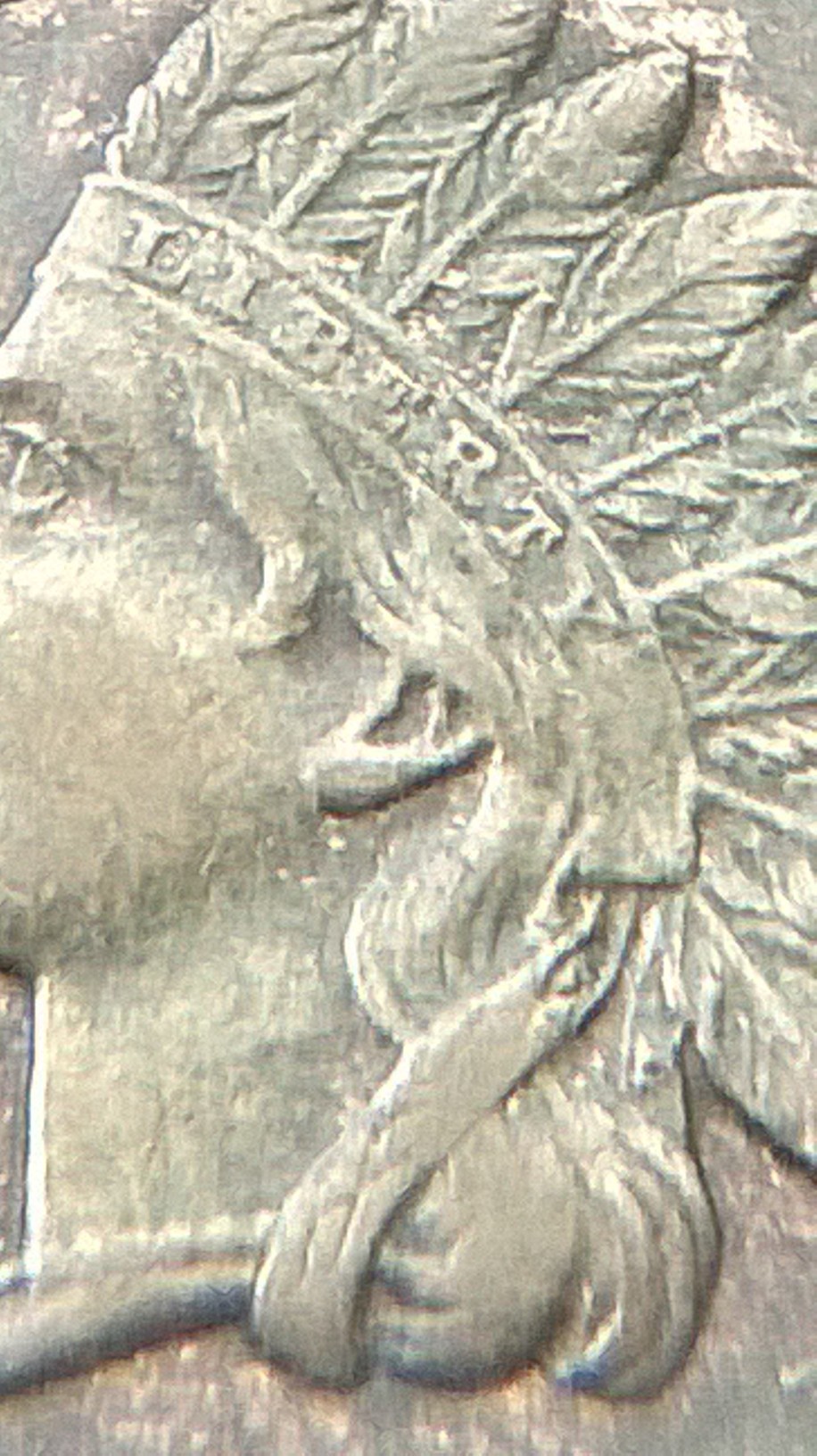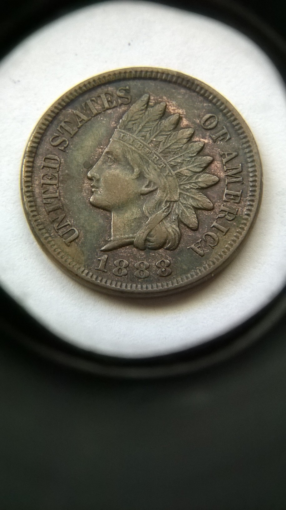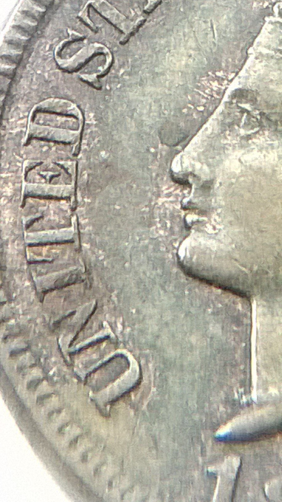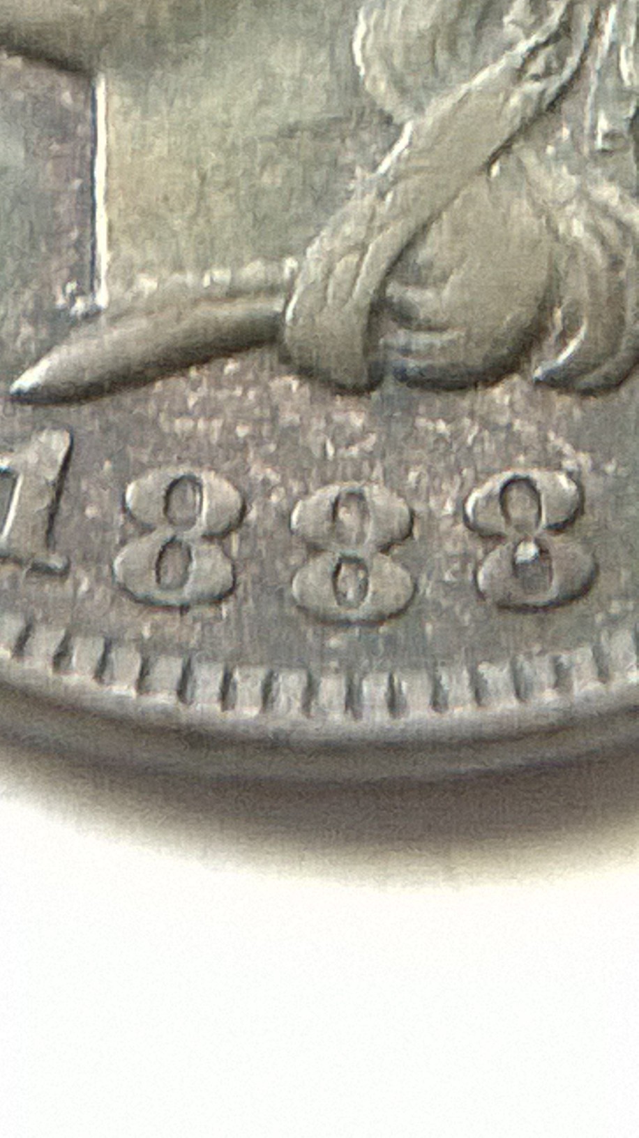 this is what i see under 10x loop on obv of IHC in date the last 8 show minor details of cross bar of (7) on top portion of 8 and the lower bar of 7 just below the bottom of loopin 8 just of center to the left you notice the piece of? in center of 8 i do not want to remove it to see if the center portion of 7 is present inside, last feather CA ? some other minor looks doubling feathers, REVERSE: shield? minor doubling beautiful natural tones either way nice find?