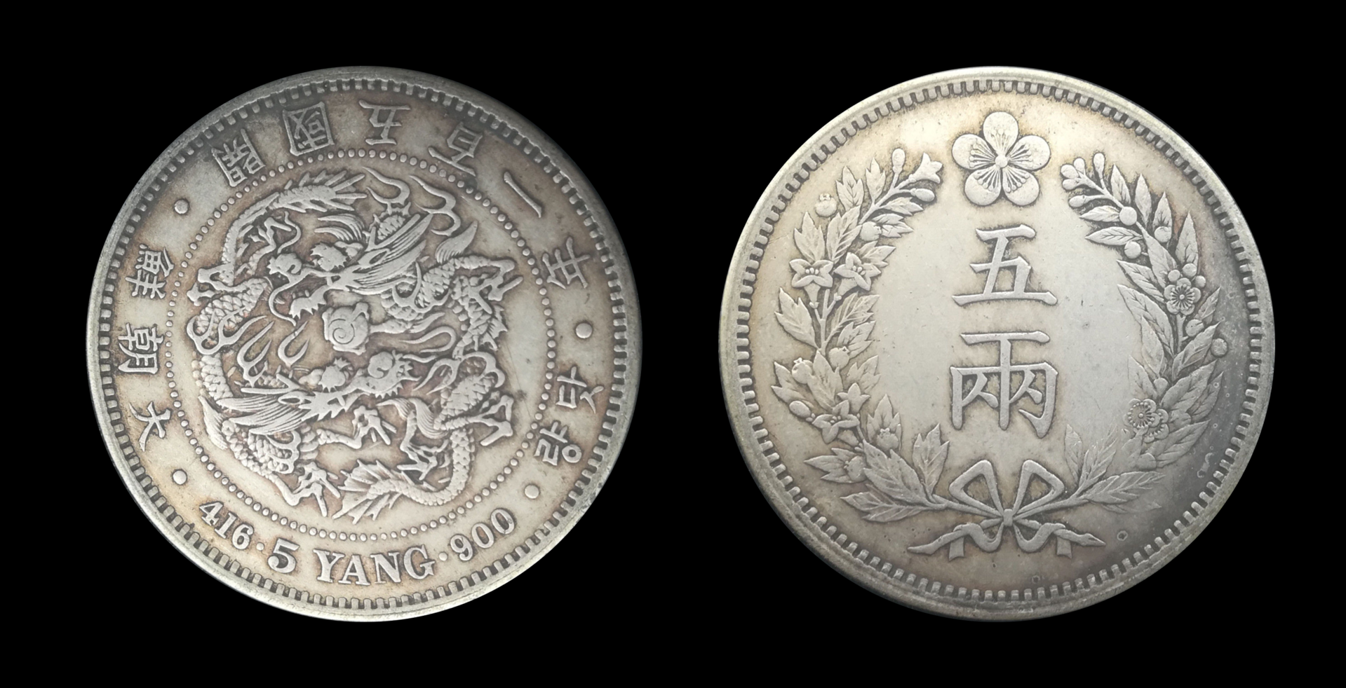 my 2004 Krause catalog has this coin... KM#1114, 5 Yang, 1892, mintage-20,000 .900 silver, weight- 26.9500 g. or 0.7798 oz. grade/value F-$700 VF-$1,200 XF-$2,000 UNC-$3,500 proof-$9,500 I am sure the values are higher now. your coin has a strange color to it. where did you buy this coin ?