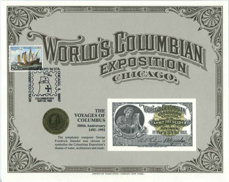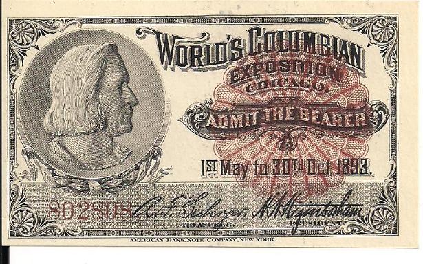 For the 1992 World Columbian Stamp Expo, American Bank Note issued a set of souvenir cards reprinting all six tickets, using the original engraved plates. The difference is they do not have serial numbers and the back of the card has a note with the ABNC logo certifying it was printed by the company. I'd be very surprised if anyone cut these down to fool a collector into thinking they were originals -- they are actually a lot scarcer than the actual tickets. You should be alert for color photocopies, however. I've seen these on ebay, but they are usually called "copies" in the description. Intaglio engravings will feel rough if you lightly run your fingernail over the raised ink; photocopies are smooth.