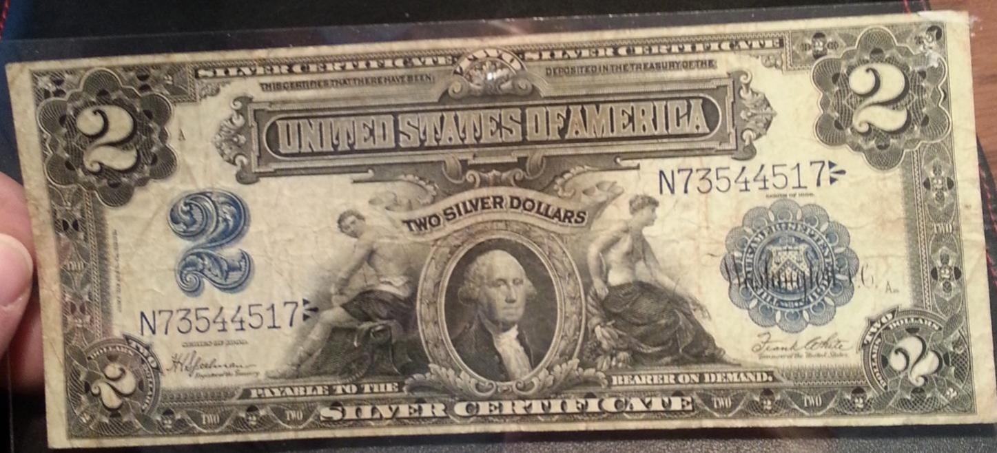 So there is two tiny pin holes on the right of the bill, i don't see glue residue, the white sticker was in the right upper corner of this holder. So assuming it grades as a 12-15 raw, what kind of price is this valued at? I got it for $90, but i thought it was under valued thanks everyone.
