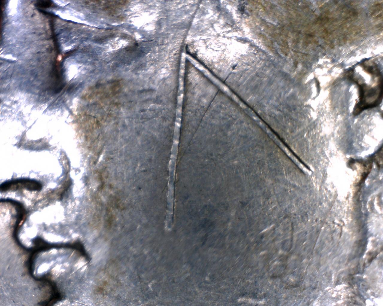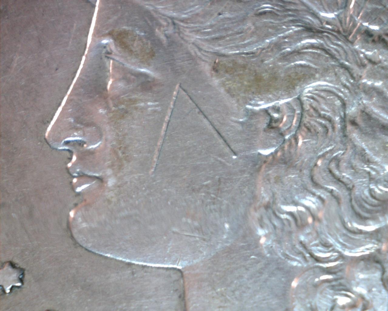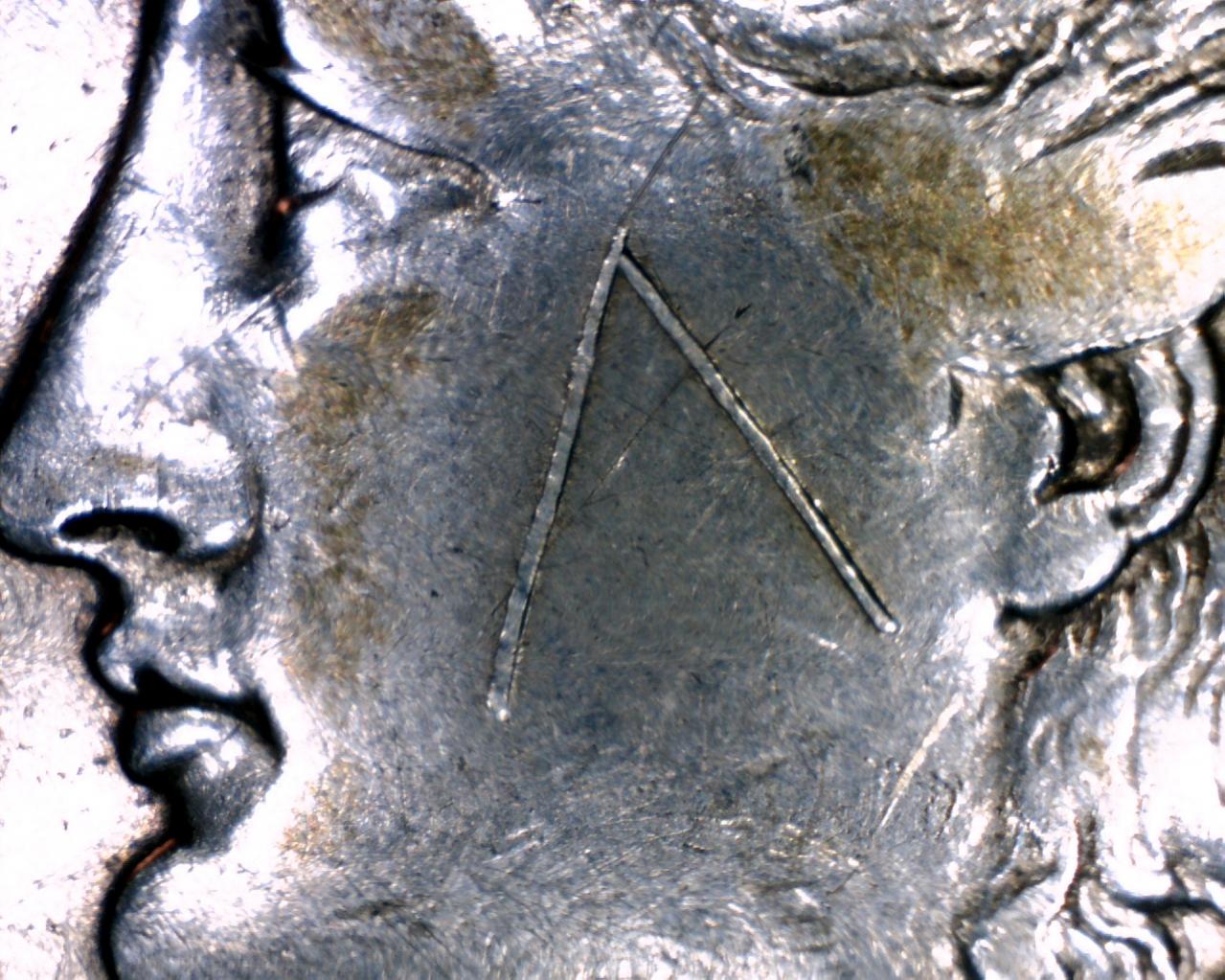 Please take a look at the photo's provided and help me find out what is going on with the coin. It shows a scratch on the cheek and then a Perfect Upsidedown V raised on the Cheek. Thanks