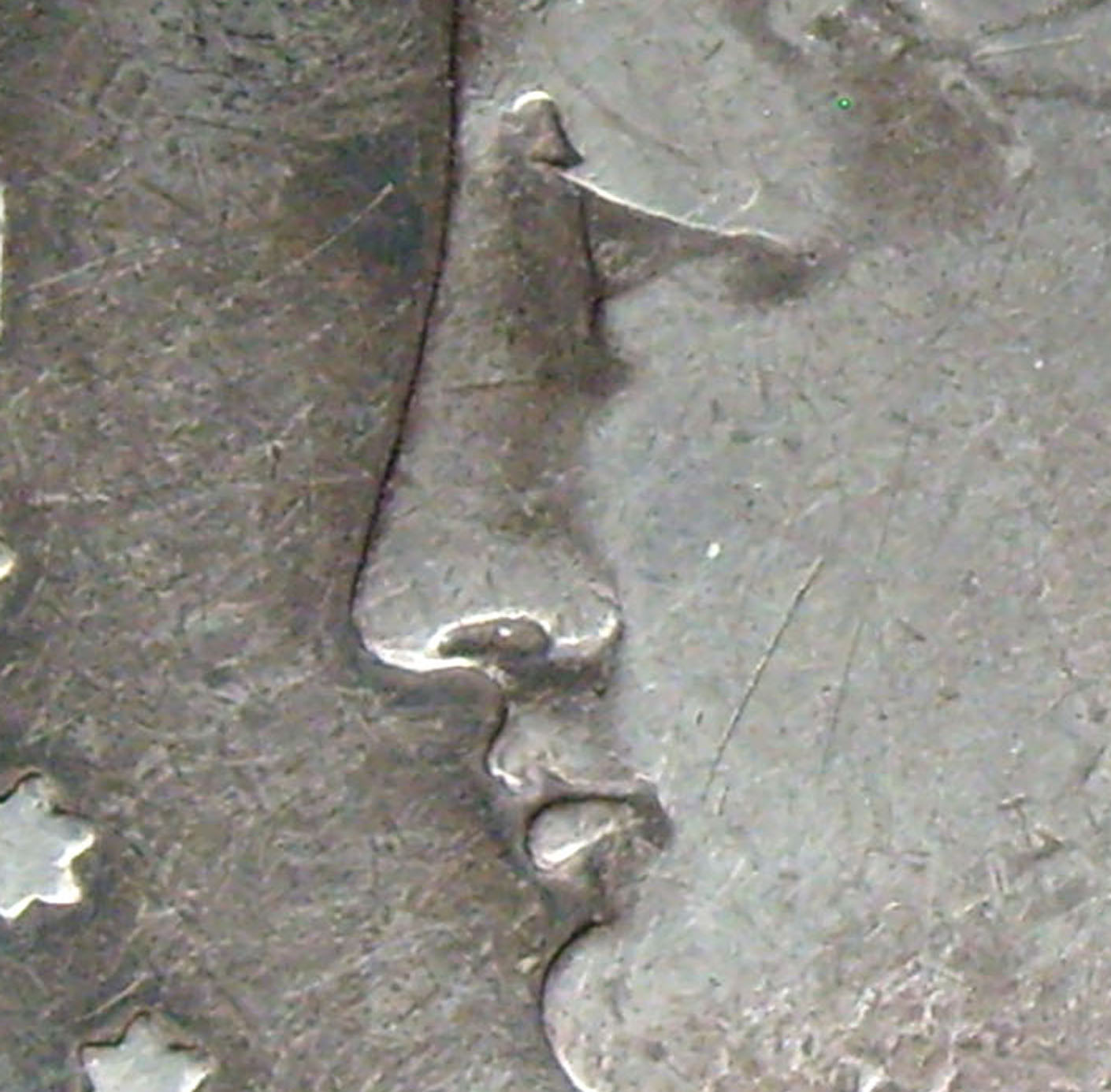 look at all the dents and dings in the surface of this dollar. It's more than likely that something hit the lady in the mouth. silver is soft like copper and a light hit from something will put a ding in it.