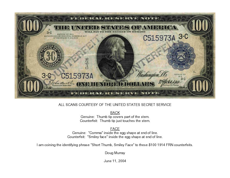 I recall this conversation on collectors.com about potential counterfeits of 1914 large size $100 notes (http://forums.collectors.com/messageview.cfm?catid=23&threadid=771515) Here's some documents from the secret service: Based on this guide, I found a counterfeit for sale on HA.com: http://currency.ha.com/c/item.zx?saleNo=348&lotNo=18217 Compared to a supposedly authentic note: http://currency.ha.com/c/item.zx?saleNo=354&lotNo=16855#Photo There have been some theories about secretive government operations because the inks and paper are identical to the real thing, and the craftsmanship is exceptional with only minor design differences like those above. Has any new information surfaced about these?