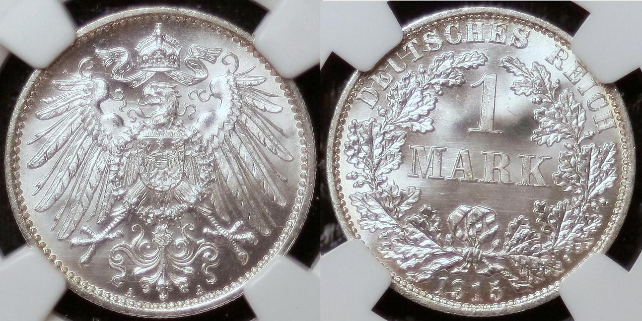 On that note, That is an absolute stunner. I am loving it. I couldn't even guess a value. I have seen 1/2 and 1 marks in ms67 ... from 1914 and 1915 go from anywhere between $90 and $200. It's all about who sees the auction that day. Yours is a prime piece worth much much more. :)