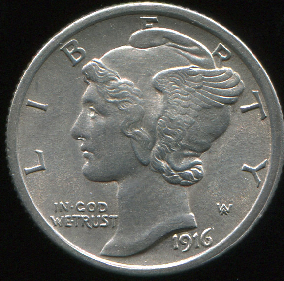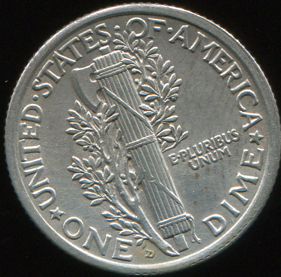 Perhaps the D mintmark which has sherifs past the far left. http://www.coinfacts.com/dimes/mercury_dimes/1916d_mercury_head_dime.htm