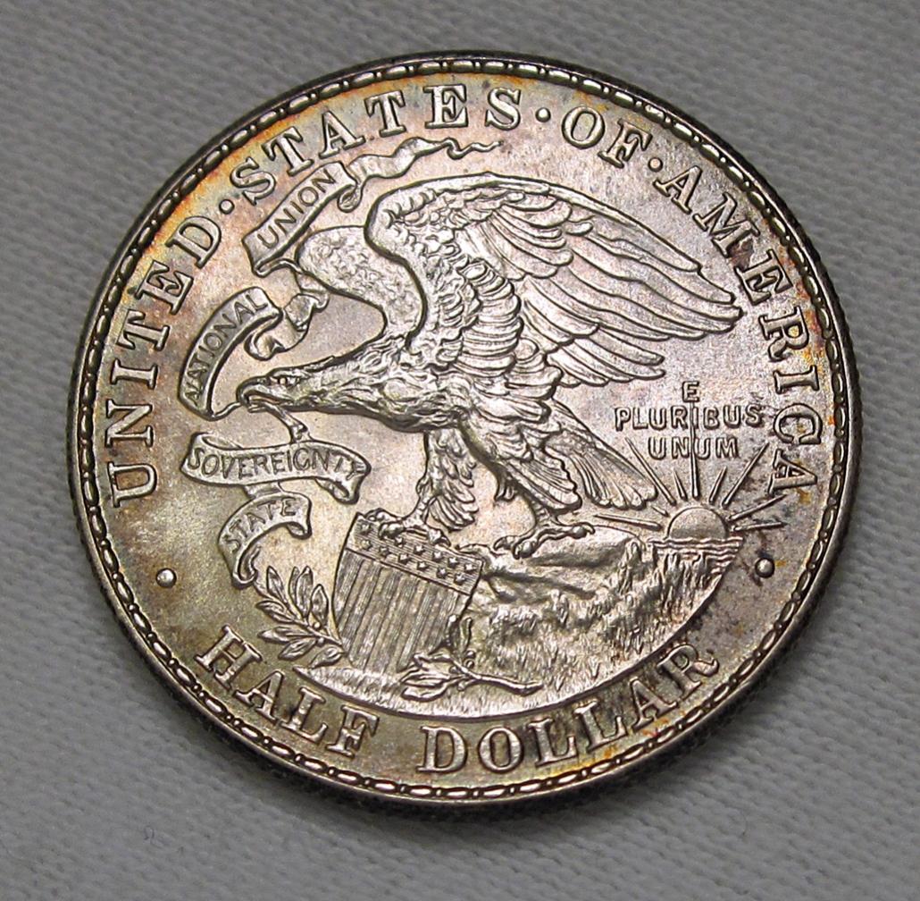 Definitely one of my favorite commems! I'd guess MS63. The fields look sort of flat and based on the light rim toning I would guess that the coin was cleaned long ago and then put in an album where it started to retone... hard to say w/o seeing the coin in person though. Has an attractive look to it in any case, congrats!!!!