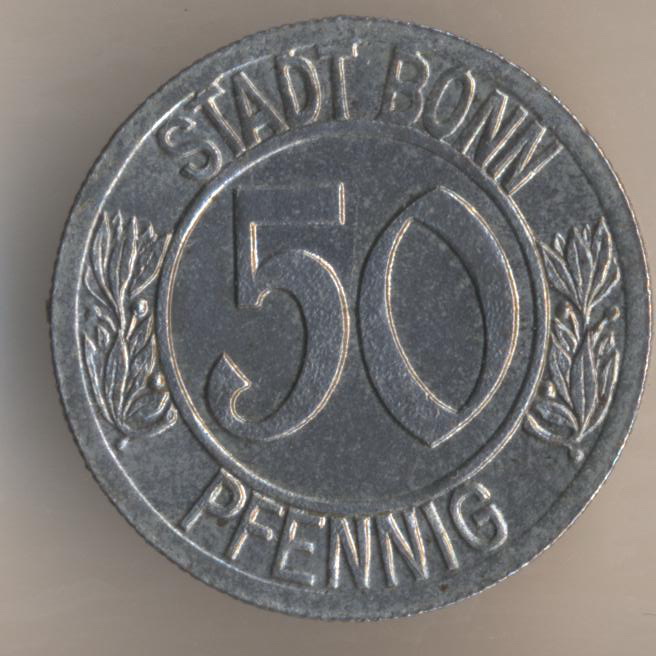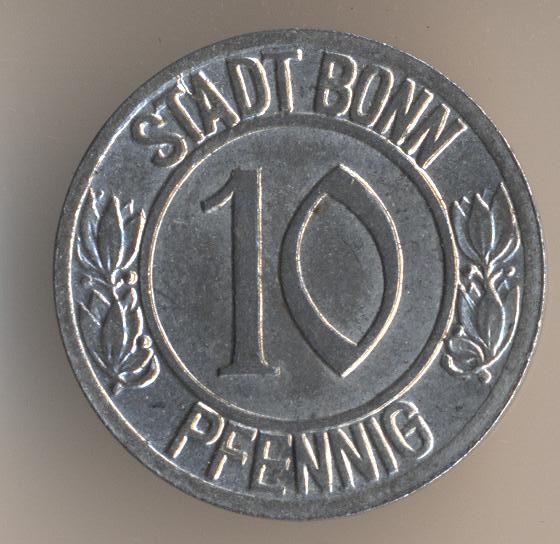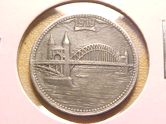 By the way, I just had a look at that Wikipedia article again; they actually charged a 2 Pfennig bridge toll at that time. The piece is not a toll token however but, as mentioned before, local notgeld. There is an interesting story "behind" that bridge; has nothing to do with the 10 Pf piece but still amusing. When that first bridge was to be built, Bonn had to finance it because the place on the other bank of the river (Vilich/Beuel, today parts of Bonn) did not want to contribute first. That changed later - but the Bonners were quick to add a small sculpture, the so-called "Brückenmännchen". People who would walk across the bridge from Beuel to Bonn were greeted by the "derrière" of the little guy. http://de.wikipedia.org/wiki/Brückenmännchen_(Bonn) You can still see it today: After WW2 the sculpture became part of the new bridge (Kennedy-Brücke) that crosses the Rhine at that place ... Christian