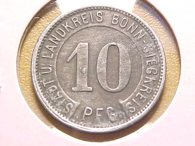 The bridge was the first one that crossed the Rhine river in Bonn - built in 1898, destroyed in 1945. The 10 Pf notgeld piece was apparently issued by the city of Bonn and the neighboring county (Siegkreis); back in those years, Bonn was on the left bank of the Rhine only. Here are some photos of the old bridge: http://de.wikipedia.org/wiki/Alte_Rheinbrücke_(Bonn) Christian