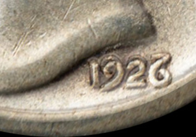 1853/4 25C Here is an overlay with your coin atop a 1927 10C. Alignment was done by the horizontal artifact on your 26 matched to the top of the 7. To me it does not appear as if this is anything more than an anomaly since what (I think) you believe to be the leg of the underlying 7 does not match in shape or form.
