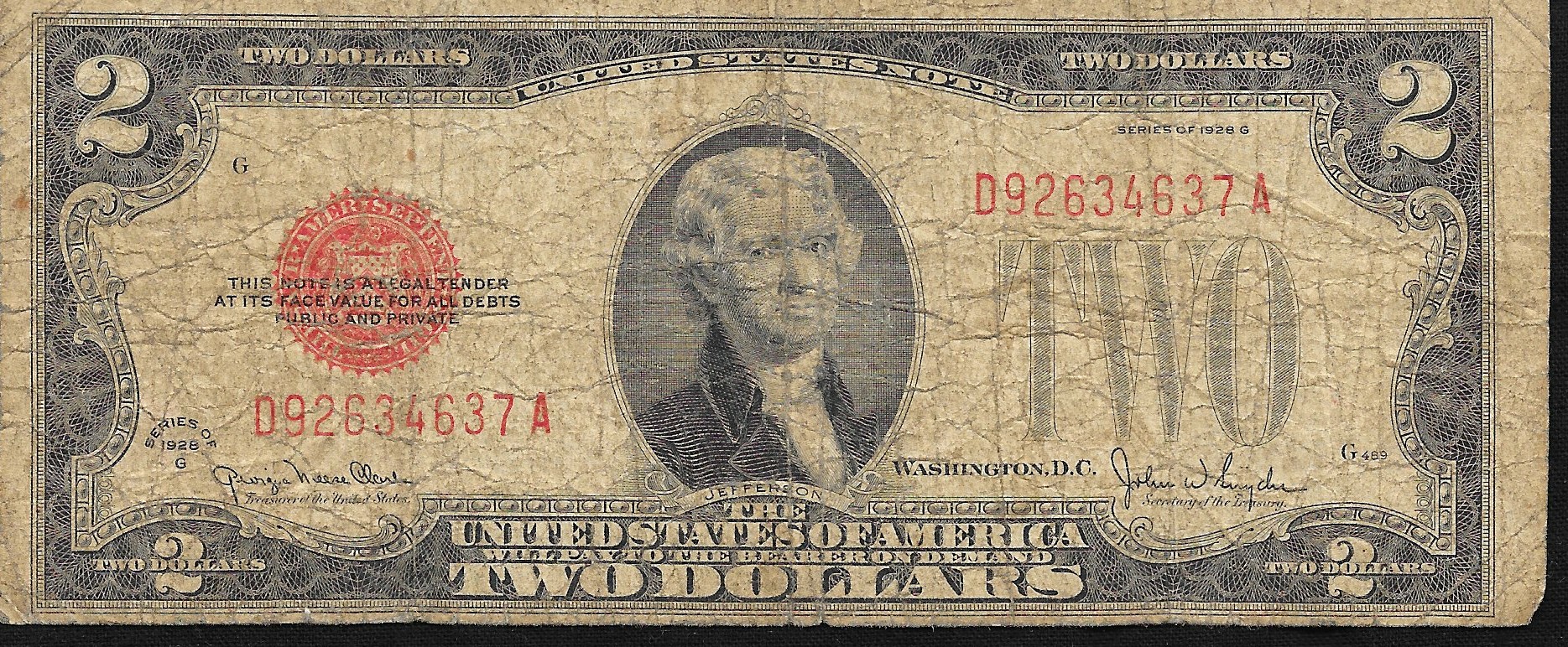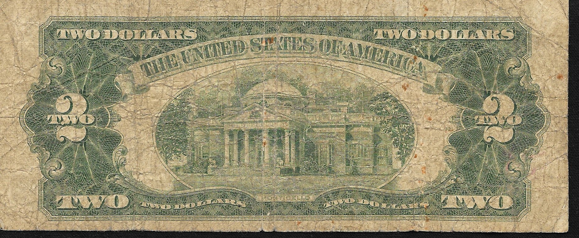 Looks like honest wear. Series 1928G $2 note was part of a 12-subject sheet. The following series, 1953 $2 started the use of 18-subject sheets.
