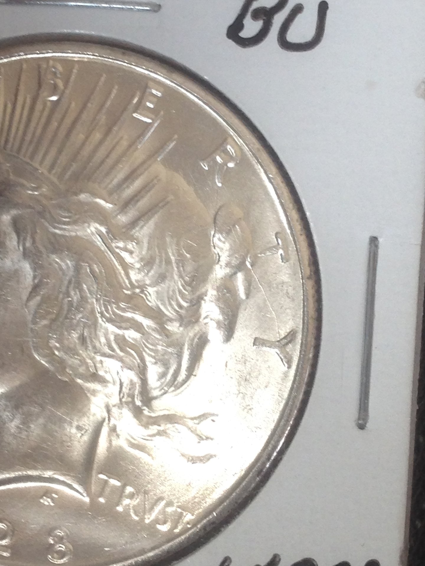 Oddly enough, in these images I'm not seeing the cheek problems that most seem to. The biggest worry to me is the damage under the T in UNITED and the L in PLURIBUS which likely makes this a Details coin. For anything else I'd want images of much higher contrast to settle the "cheek issues" once and for all. Look closer at TRVST. I didn't see anything at VAMworld resembling what looks like strong northward doubling of the T, although that could be MD. If you're into it (and he's willing), it would be a nice thing to ship this to John for attribution; that crack is a "smoking gun" pickup and ought to be a matter of record at VAMworld. Peace Dollars aren't getting the attention they should, and any potential addition to the body of knowledge is a good thing, even if it's only an entry (for the moment) into the VNA for the issue.