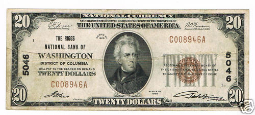 I've seen the Tampa National a few times, but the price is always too high. The Scranton Nationals I have seen always seem to go quickly at auctions and again, I have seen a few range over the 200 dollar mark. Thanks for sharing. Here is a 1929 20.00 note from Riggs Bank here in D.C. $20.00 The Riggs National Bank of Washington, District of Columbia Bank Charter # 5046 Type 1 “C-A” Block C008946A No rips, tears or pinholes. Two folds, one vertical and one light center fold. Note still retains some crispness. The Riggs national bank is also known as “The Presidents bank.” After accepting a government charter, "Riggs National Bank" was born in 1896. By 1900, Riggs was twice as large as any other bank in the capital. In 1909, Riggs' president formally presented to the U.S. Congress a plan for economic relief. Many financial reforms were implemented as a result of this plan, including the establishment of the Federal Reserve in 1913. Beginning in the early 20th century, the bank embarked on a successful project to become known as the bank of embassies and diplomats, and by 1950 most embassies in Washington were customers. Many branches thereafter opened within embassies in Washington D.C. and London. In 2002, Joseph L. Allbritton, the Chairman of the Board, was inducted into the Washington Business Hall of Fame. Through its history Riggs Bank served many notable personalities. Twenty-three U.S. Presidents or their families banked at Riggs, including Martin Van Buren, John Tyler, Abraham Lincoln, Ulysses S. Grant, Dwight D. Eisenhower, Richard Nixon.[2] Accounts were also held by Senators Henry Clay, John C. Calhoun and Daniel Webster, Confederate president Jefferson Davis, American Red Cross founder Clara Barton, suffragist Susan B. Anthony, and generals William Tecumseh Sherman and Douglas MacArthur