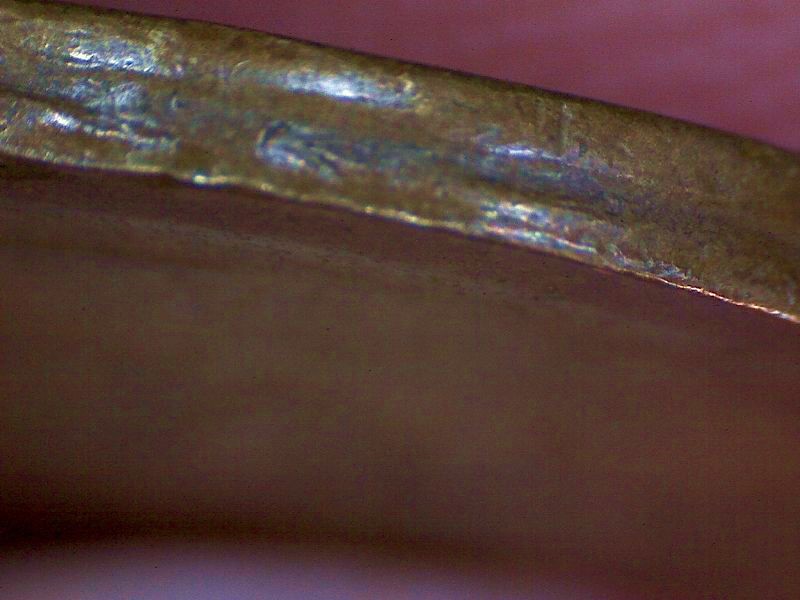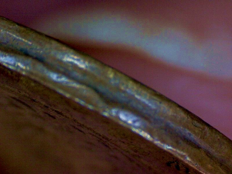 Obverse has a wide varying rim that completely covers the L in Liberty. The reverse is the same with a light strike or cover of the ONE . The outer rim has a groove.
