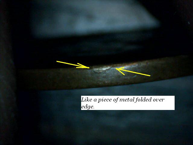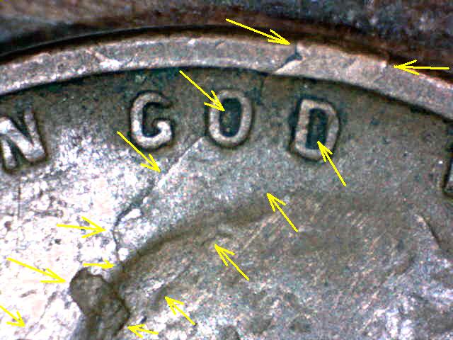 I found this 1934 Lincoln Wheat Cent searching rolls a minute ago. It looks weird like it was struck through a strip of something or has a lamination problem. There is a narrow strip of metal, (from on the edge, through the "O" & "D" of God, through the tip of the back of the head, through "RT" of Liberty, to the other rim), that looks like if you could get under it, it would peel off. There are 2 small places that are gone, behind the head. Take a look and any help will be greatly appreciated! Thanks! The pics are in order the way it travels down the obverse.