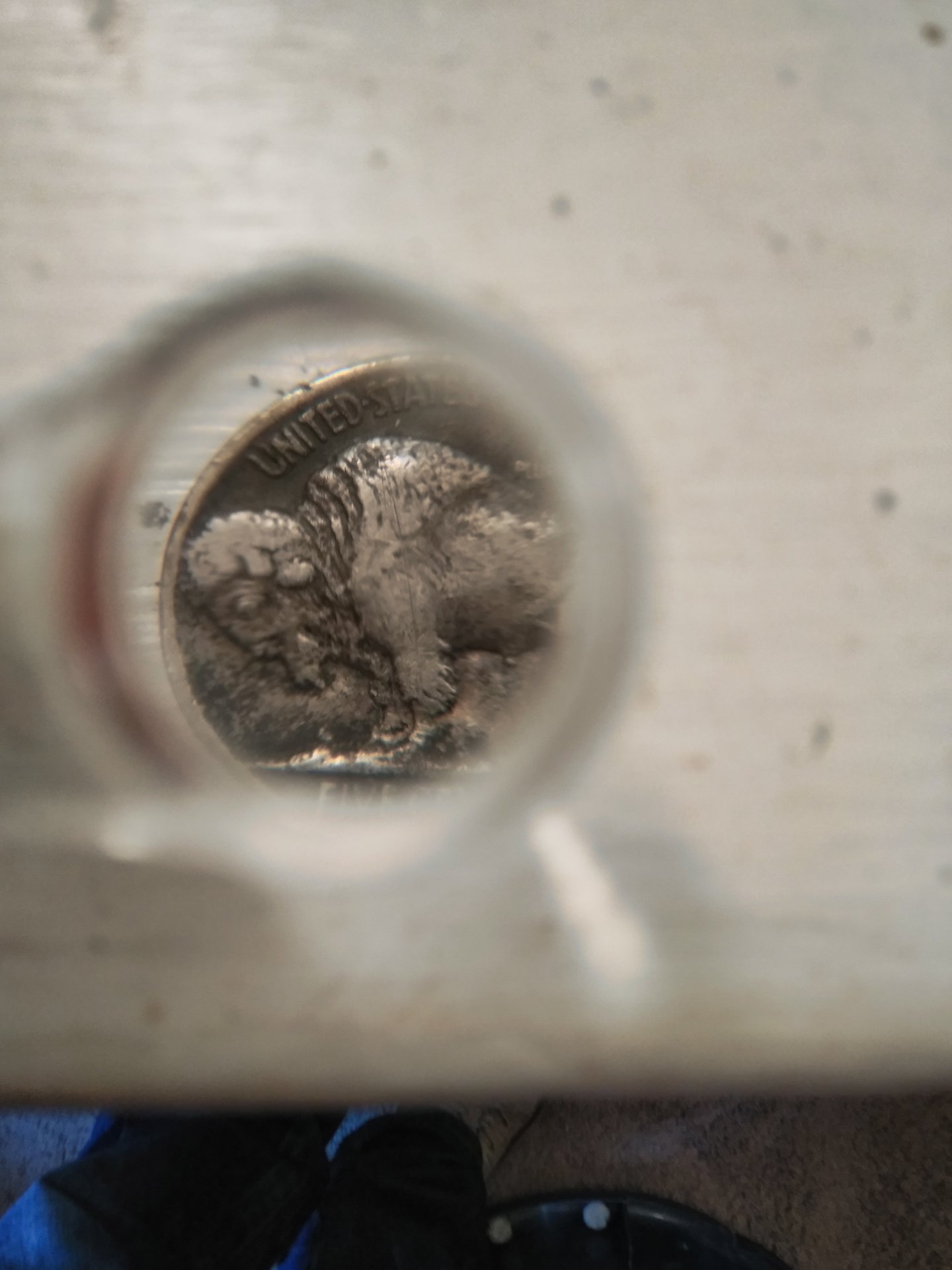 If you zoom in on the pic and look at the 1936 3 1/2 leg buffalo nickel you will see what I see. The spacing in between the legs. The gap at the bottom by the foot