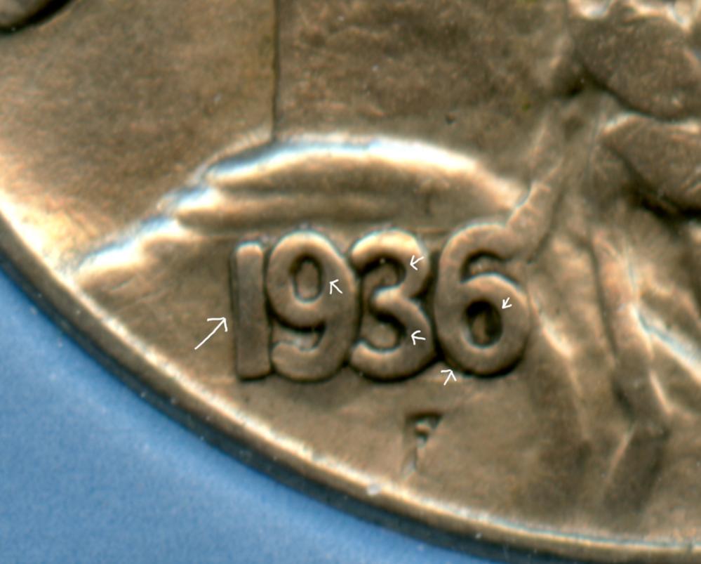 Hi, I was looking very closely at a 1936 S Buffalo Nickle I have and noticed you can see a double of the date by the 1, and a slight double on the rest of the numbers. The six is also very clear. I know there is a 1936 double die, but I have not seen anything for the 1936 S. Am I crazy or not...have any of you seen this? I am sure mine is an S mint mark. P.S. I am scanning a really high resolution image of the date to add here, but that will take a while to do. Thanks