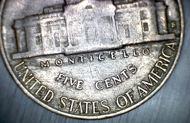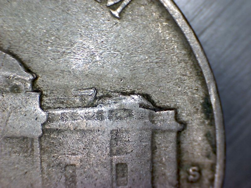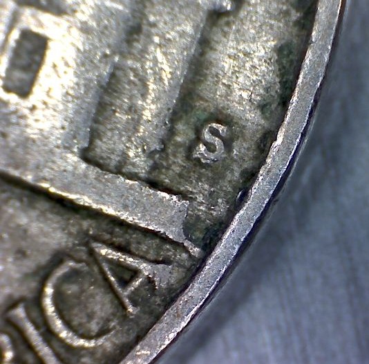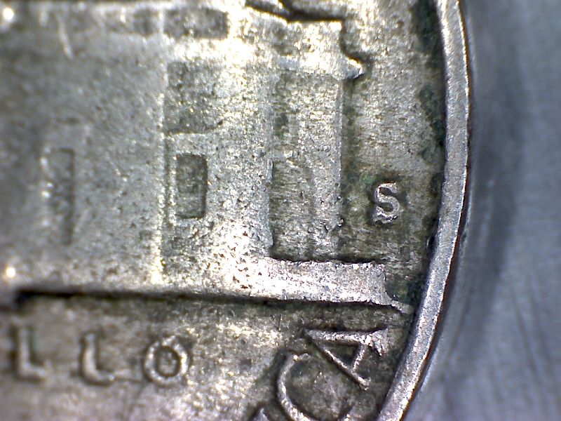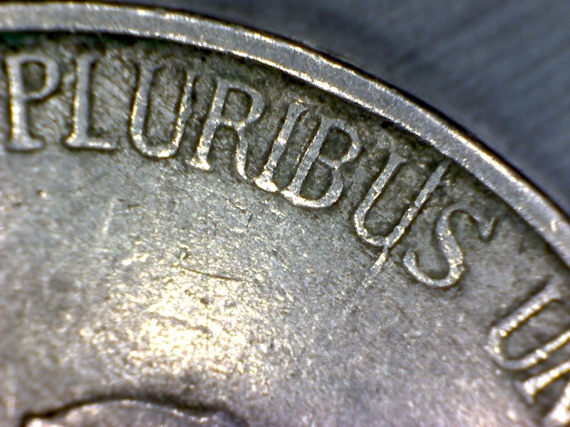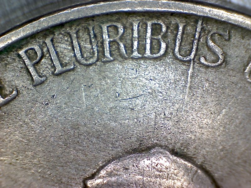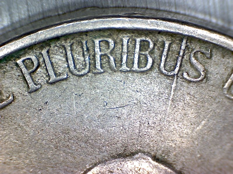 Dbl. MM, big die break on top right building, "spear" die break, through "u" in Pluribus, small die breaks on "F" in of, center of "m" in America, on bottom of "E" in Liberty and "u" in trust.