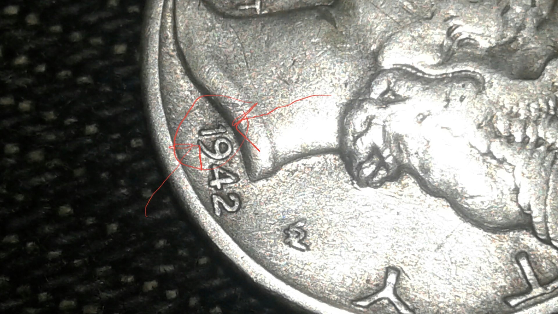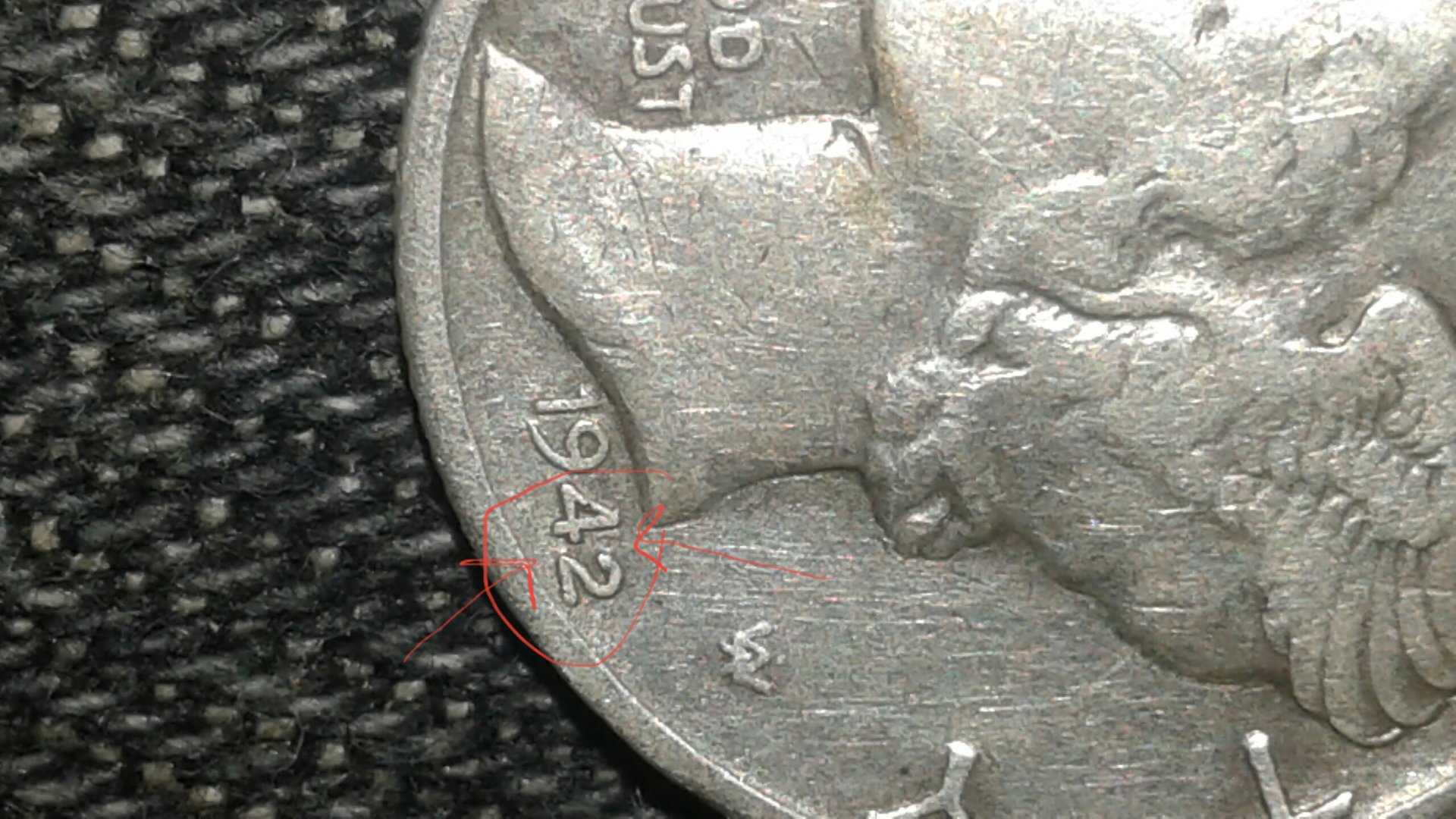 I've yet to see anything claiming that the 42/1 D was/is easy to detect. I've looked at it for some time with something like a jewlers loupe, and when I took the pictures, it's with my old phone that's falling apart but since it still works for the most part, I refuse to buy another one. The camera on this this is far from the best, and for the subpar pictures I apologize. I know I can be trying to convince myself of what I see, may have, but I still see blobs on the 2, and a ghost of a 4 next to it. Not in the exact position as 2 pictures I've been able to find that supposedly are real, so I've shot a bunch more, amd marked where and what I'm seeing. I.also marked what seems to be a shadowed 1, the 19 side. I haven't seen mention, but wonder what im seeing all the same.