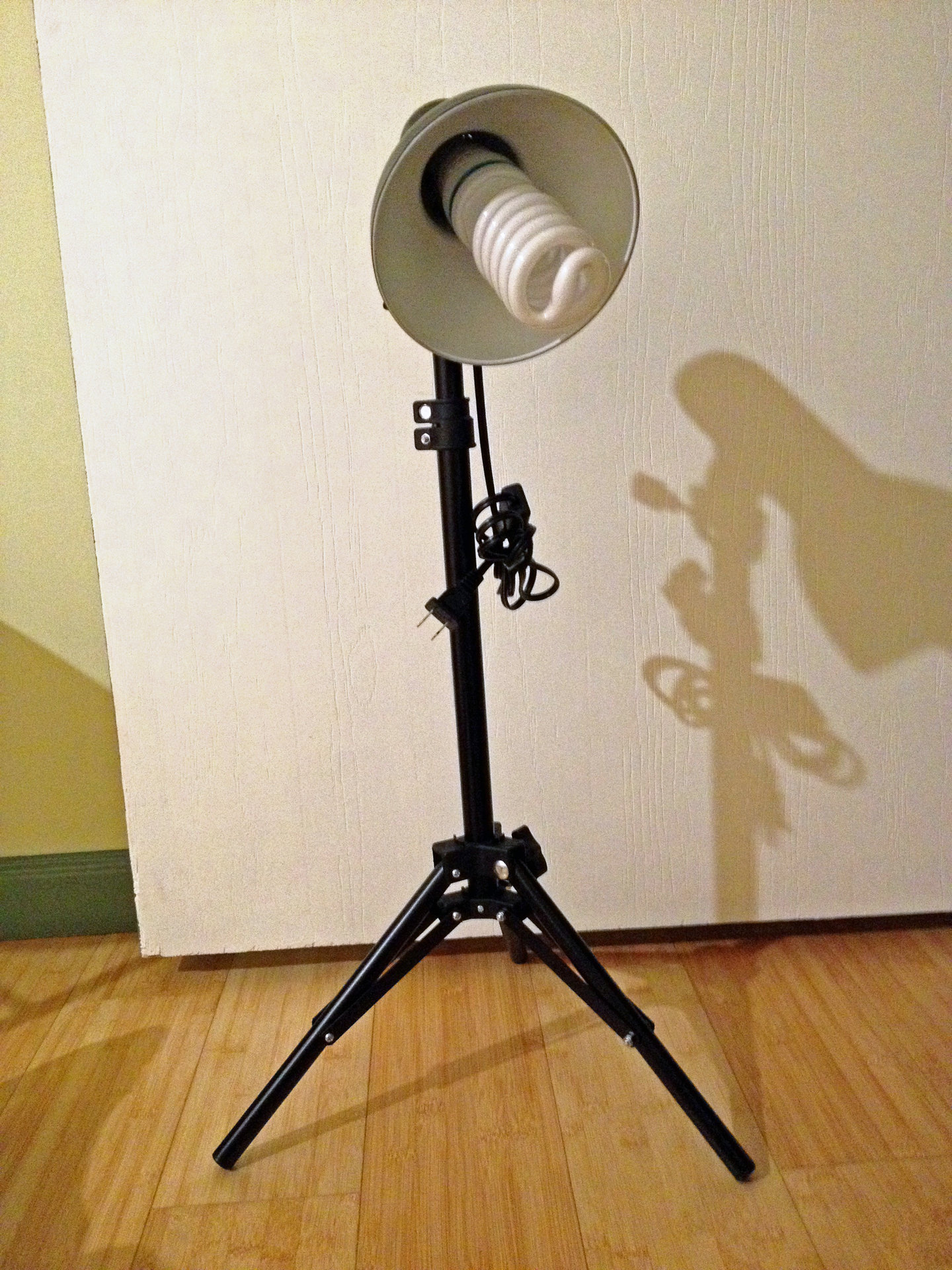 The Paper Towels and Soft White Bulb do provide some diffusion--the results would have been far worse if you didn't use them. The Incandescent Lamp with a single filament is the problem; even with a coated bulb it is a Point Source (just look at the shadow the Filament casts on the glass envelope, or on a solid surface if it is a clear bulb). That Point Source of the glowing Yellow-White Filament creates a hot spot where it is projected onto the surface, and if that surface is shiny, that light reflects off at all different angles (due to the surface texture) and creates glare. For my photography I use either LED Spot Lamps (dimmable), LED Flood Lamps (dimmable) or for these very reflective coins like yours, CFL. When I decided to invest in a good DSLR and Macro capability I also researched lighting that I could adapt to my setup for both normal photography of items for sale on eBay, and for coin photography in particular. I came across a kit by Julius Studios (Julius Studios Table Top Light Kit JTK141 @ $42.63 on eBay) that had what I needed: 2 ea High Intensity 45W (200W equivalent) Photo CFL Bulbs (6500K) in an adjustable Tripod Stand, with a Light Tent (30"x30"). It is very well built and good quality for the money. I don't use the Light Tent too much, but the different color velvet cloth inserts are nice for background shots. Here is what one of the Stands looks like (shot with my i4S):