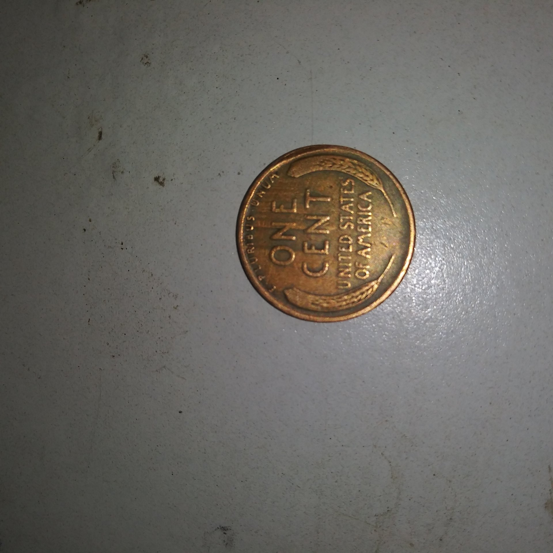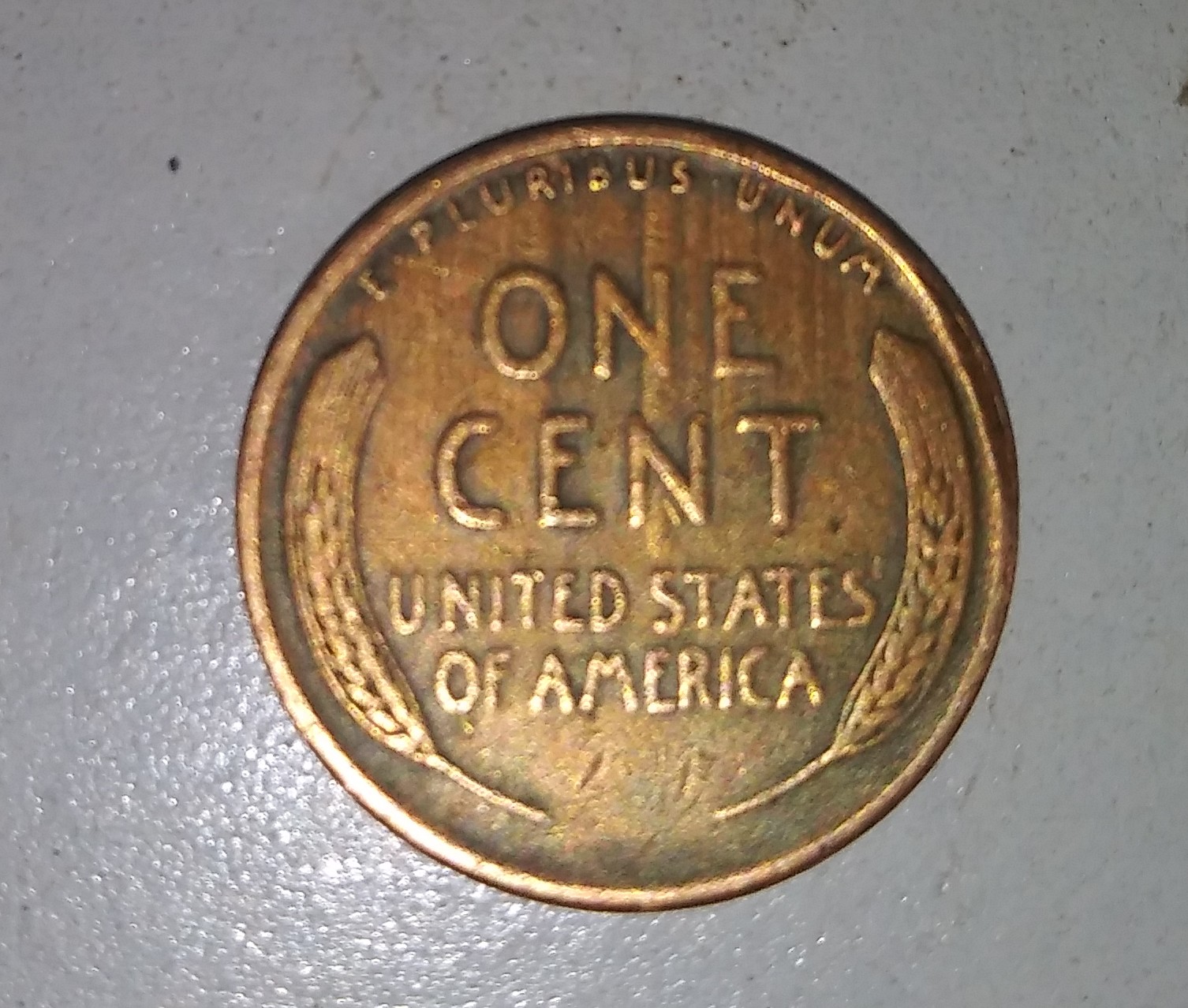 i have a 1944 s wheat penny with unknown line marking on the reverse side of coin the coin also has a small indent on rim it can be seen from the reverse side middle right coin also has a grayish tone as well as copper color if anyone could give me some info on the markings would be great. thanks bibs