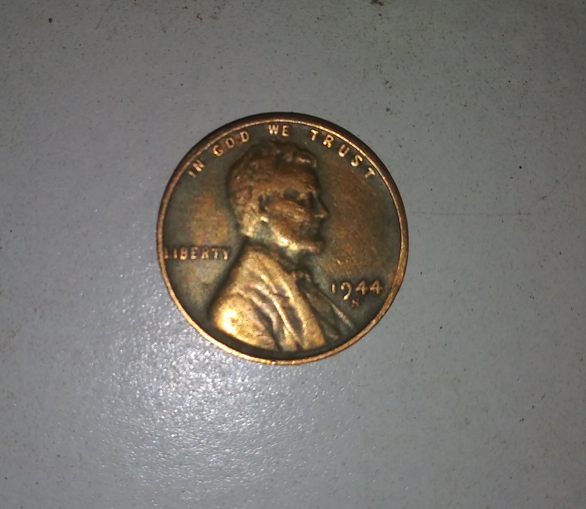 The photo has the appearance of a mix variation of the metal. Since 1944 was the year that " theoretically" the government melted copper shell casings for the coins. If true, some may not had been as cleaned as others so scavenged for use and caused such. But many dispute this as hearsay and that it was for patriotic reasons. from Wiki. In December 1943, the Treasury Department announced that the steel cent would be discontinued after 1943, to be replaced with coins containing 95% copper and 5% zinc (pre-1943 cents contained the same percentage of copper but might also contain tin in place of some of the zinc). The Treasury also stated that some of the metal for the new coins would be obtained by melting down small arms ammunition shells.[47] However, numismatic writer Shane Anderson, in his study of the Lincoln cent, doubts that any shells were melted down, except perhaps ceremonially. https://en.wikipedia.org/wiki/Lincoln_cent