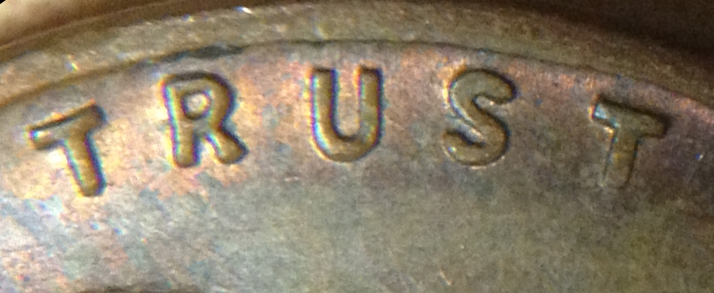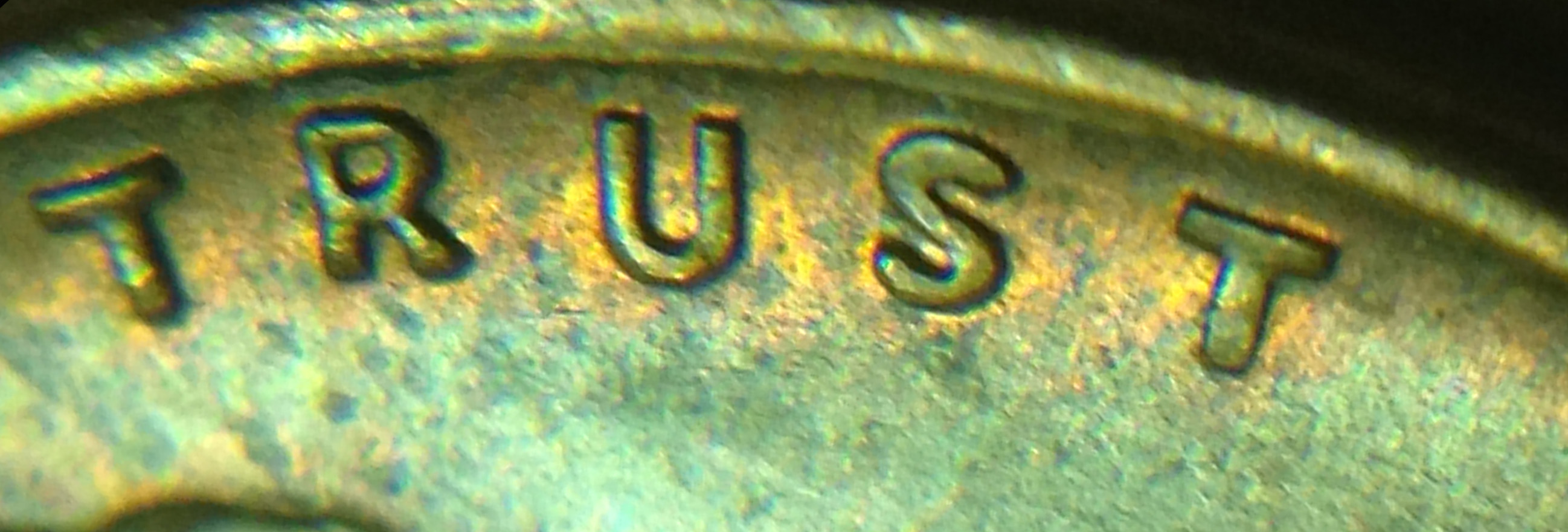 Well you haven't posted pictures of the word TRUST on your coin, so I can't really help you match it up. Any chance you could post photos of them?
