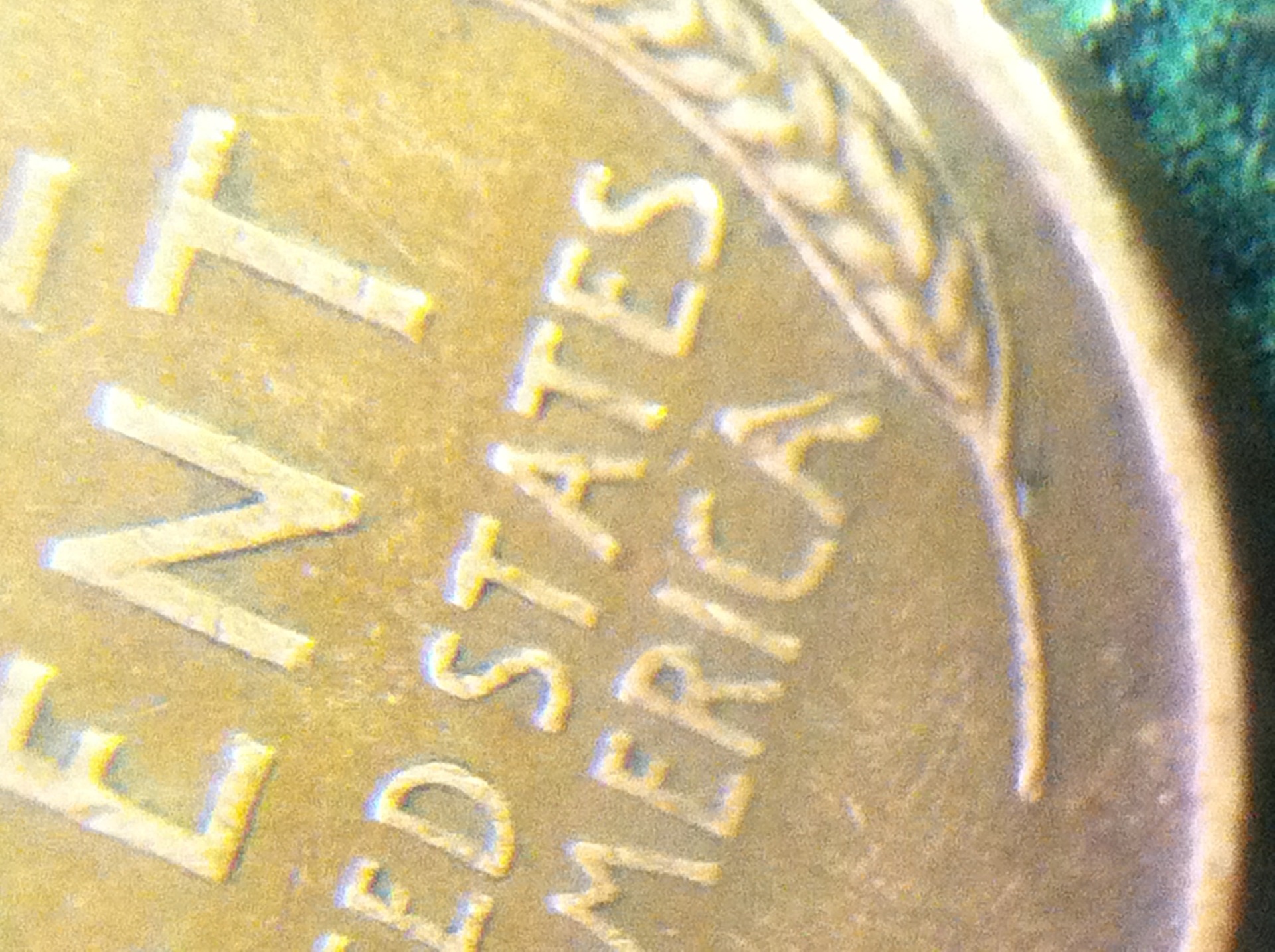 Sometimes, something similar to this could be caused by a strikethrough such as a piece of wire between the planchet and the die when it was struck, but in this case, it is obvious that it is PMD. If it had been a strikethrough, you would not see the right leg of the "A" flared out as it is. It would just be a straight line impression extending across the letter. This "flared leg" suggests that something pushed the metal out of the way after the coin had been struck. Chris