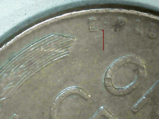 Points to the die marker, looks like a tiny chip. The shadows make mine look a bit off to the left but it is right there. I can't even see the doubling in their photo.