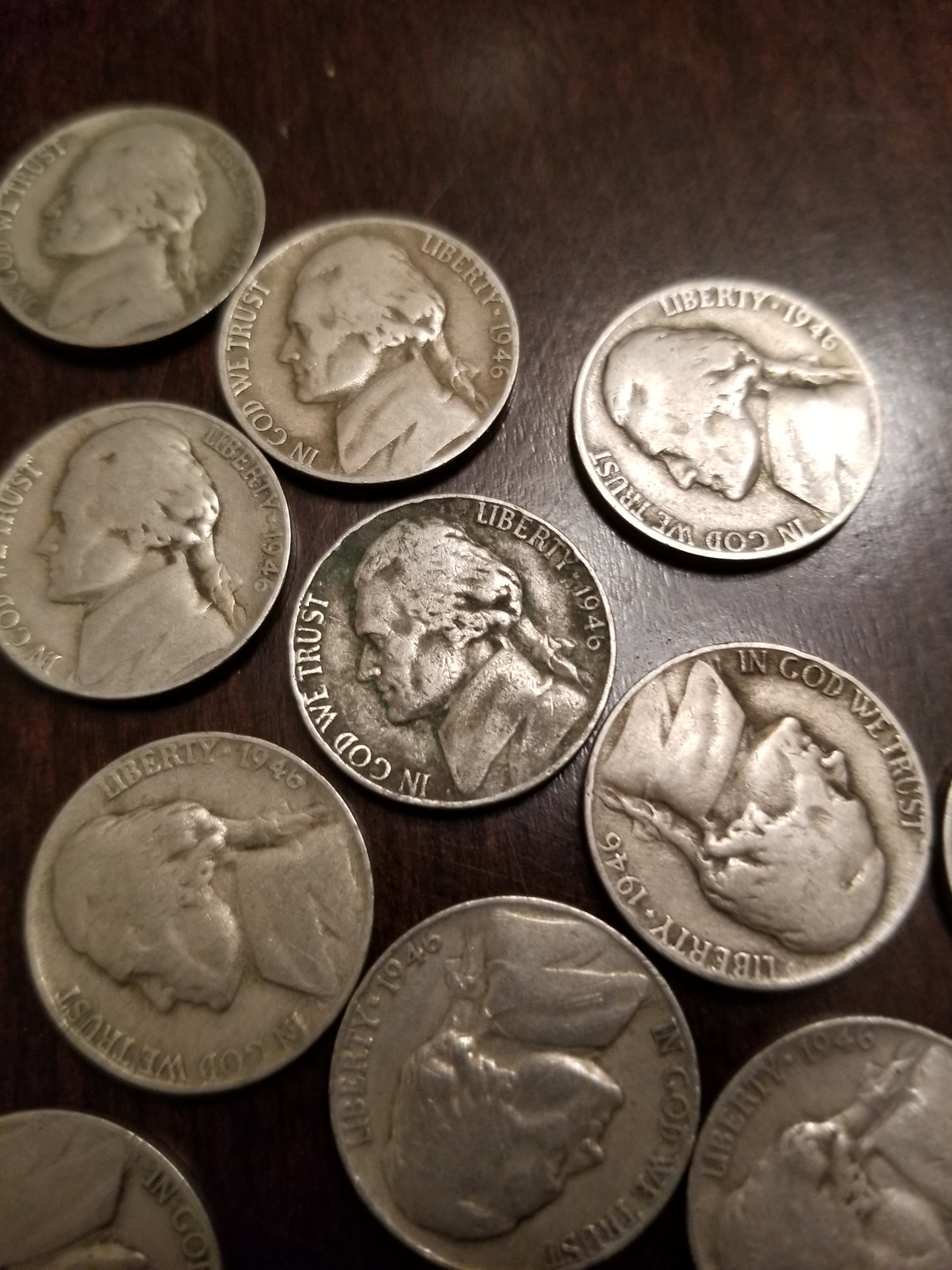 I have a roll of 1946 nickels that I was given about 25 years ago. I've had them in the wrapper roll all those years. Today I opened it to look at them and I noticed one stands out from the rest due to its color. What would cause this? Maybe being in circulation longer before being put away to save it? It is just darker (dirtier?) than the others or is it a different metal than the others? Any thoughts?