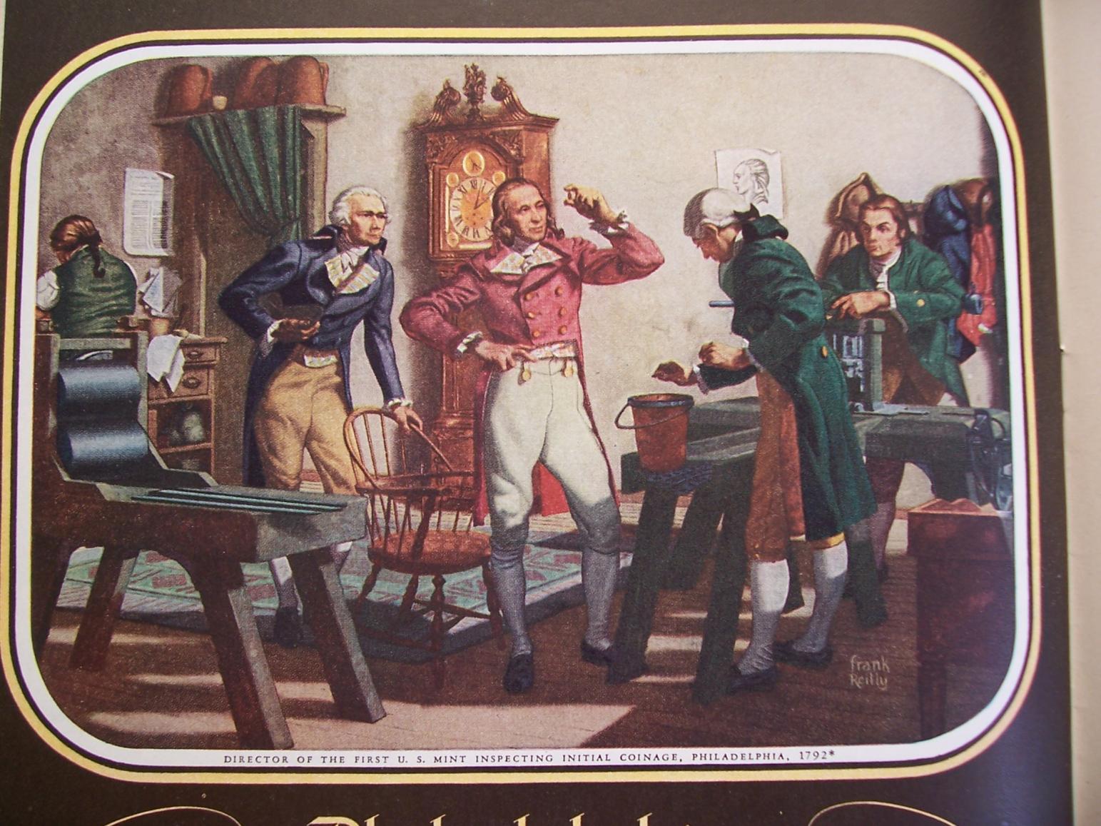 I was recently given a large lot of old magazines and found this ad of interest to coin collectors. The caption is "Director of the First US Mint Inspecting Initial Coinage, Philadelphia, 1792." I expect that David Rittenhouse is either saying, "I see a bright future for us, gentlemen." or "Hey, you spelled 'dime' with an S."