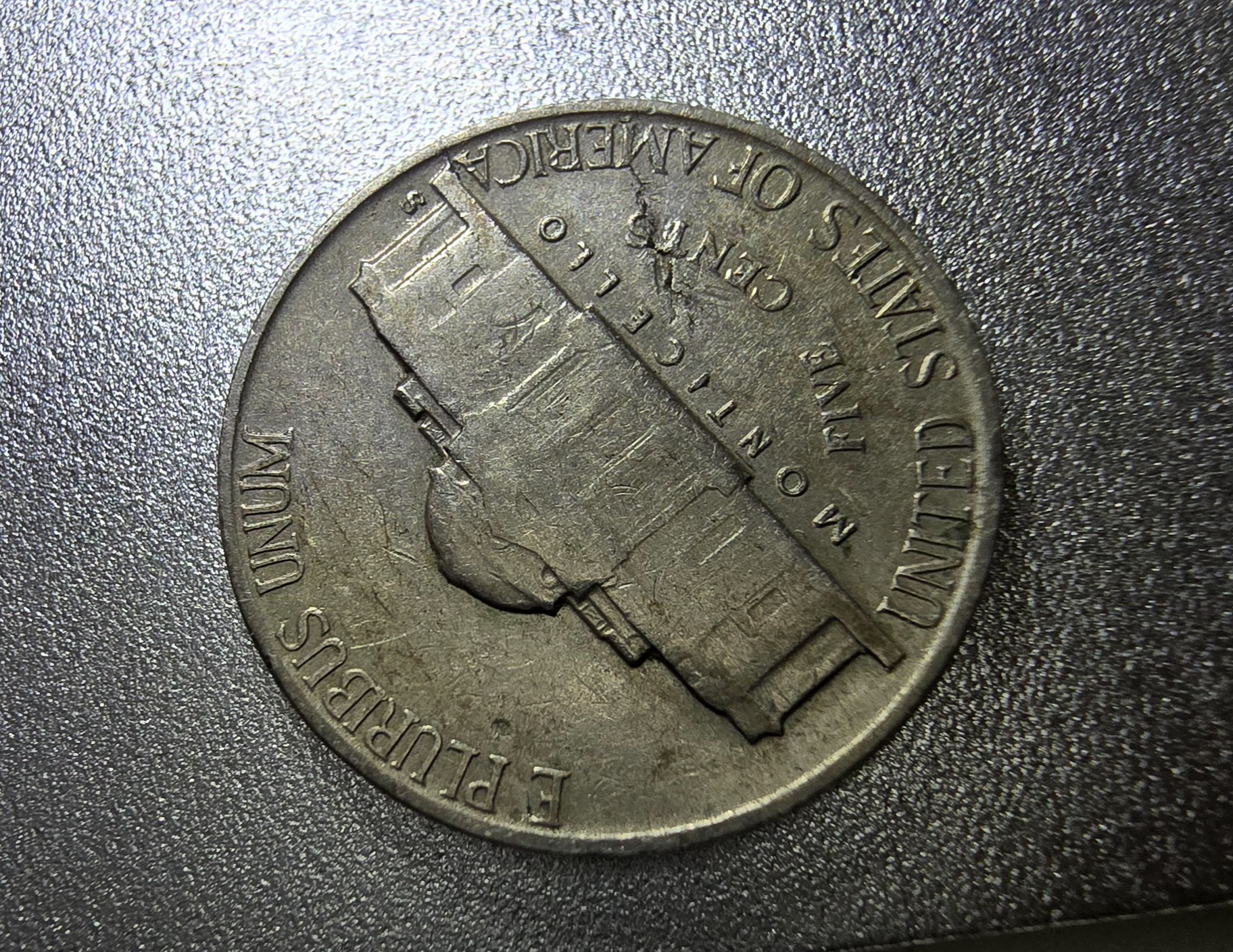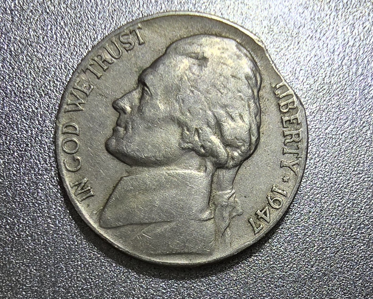 Hey guys I need your help on this one it's a 47s it looks like it's the ponytail of Jefferson if you turn The Coin over that's the exact spot for his ponytail or it's just a lamination error I think I never had one of those