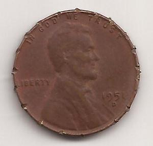 Hello. What made these strange cuts or notches on this penny? I had one guy say scissors or a nice but look very closely at the cuts. It's almost like the cuts have a weld like look on the lips of the cuts. I don't think it was a knife or scissors. I think the cuts wouldn't look the same. I'm wondering if someone pressed it in something that made the cuts? Also, the cuts seem pretty evenly spaced. Either way, weird coin.