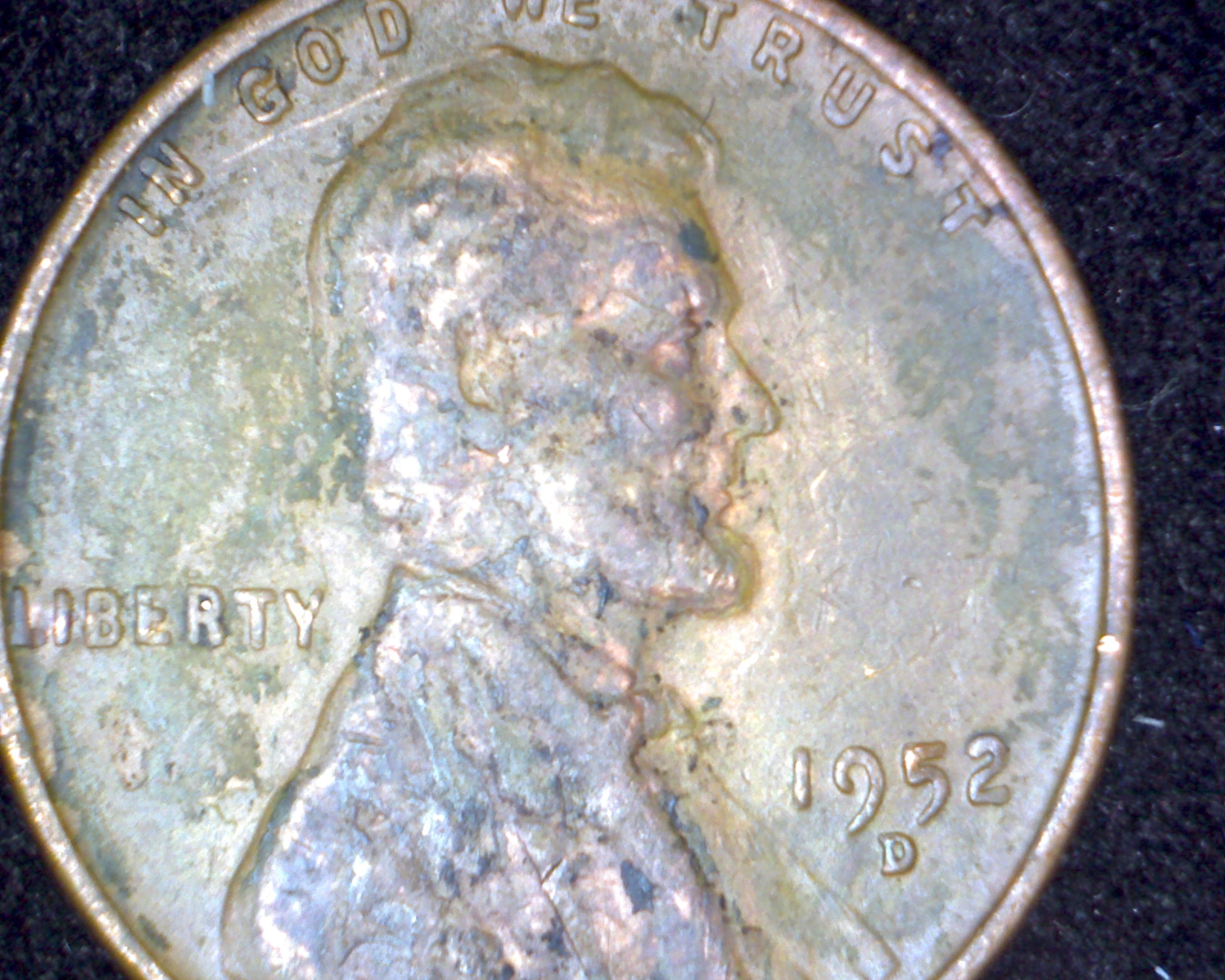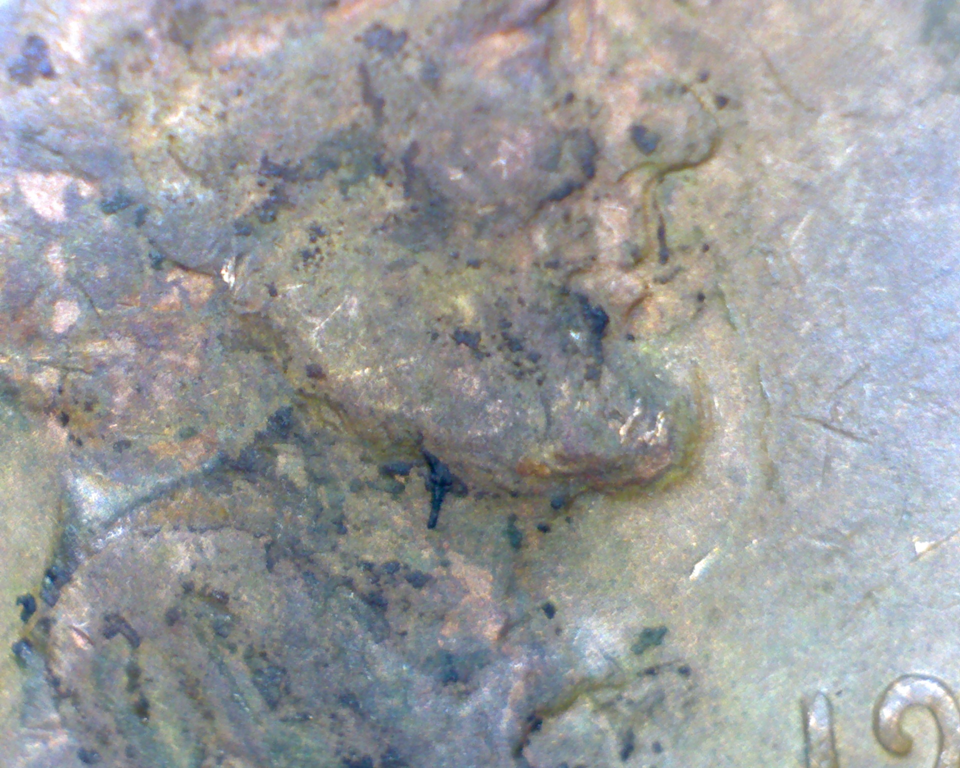 Also "liberty and some if the other lettering was covered in green but look normal when revealed, which discounts rot as the cause of any distortion. What do you see?