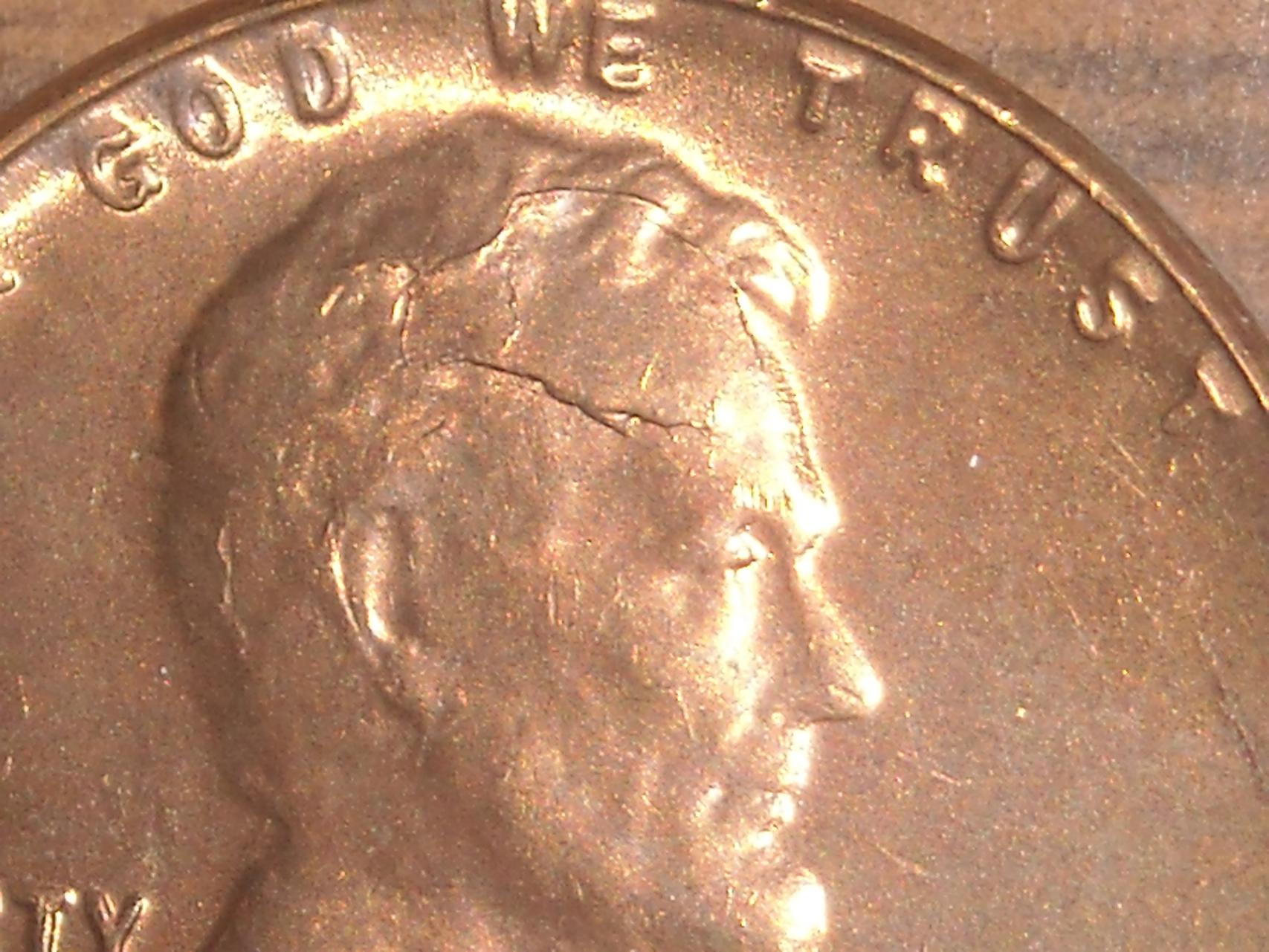no cuds but looks like die breaks the wheats . hmm i see the people on ebay selling these , "cracked skull lincoln rare!"