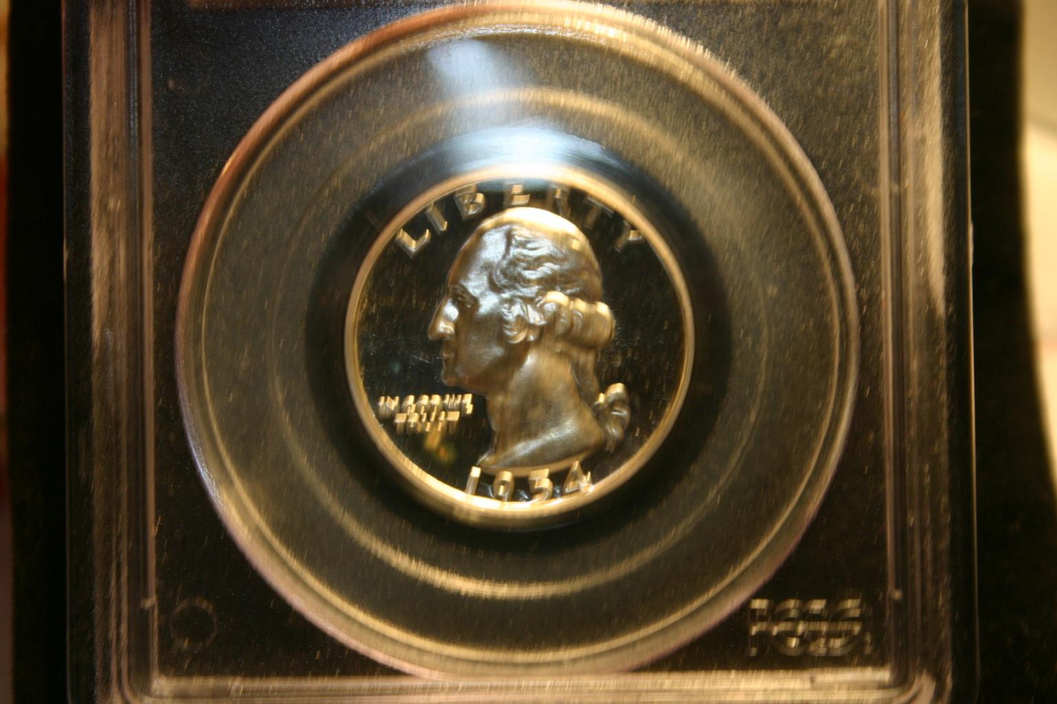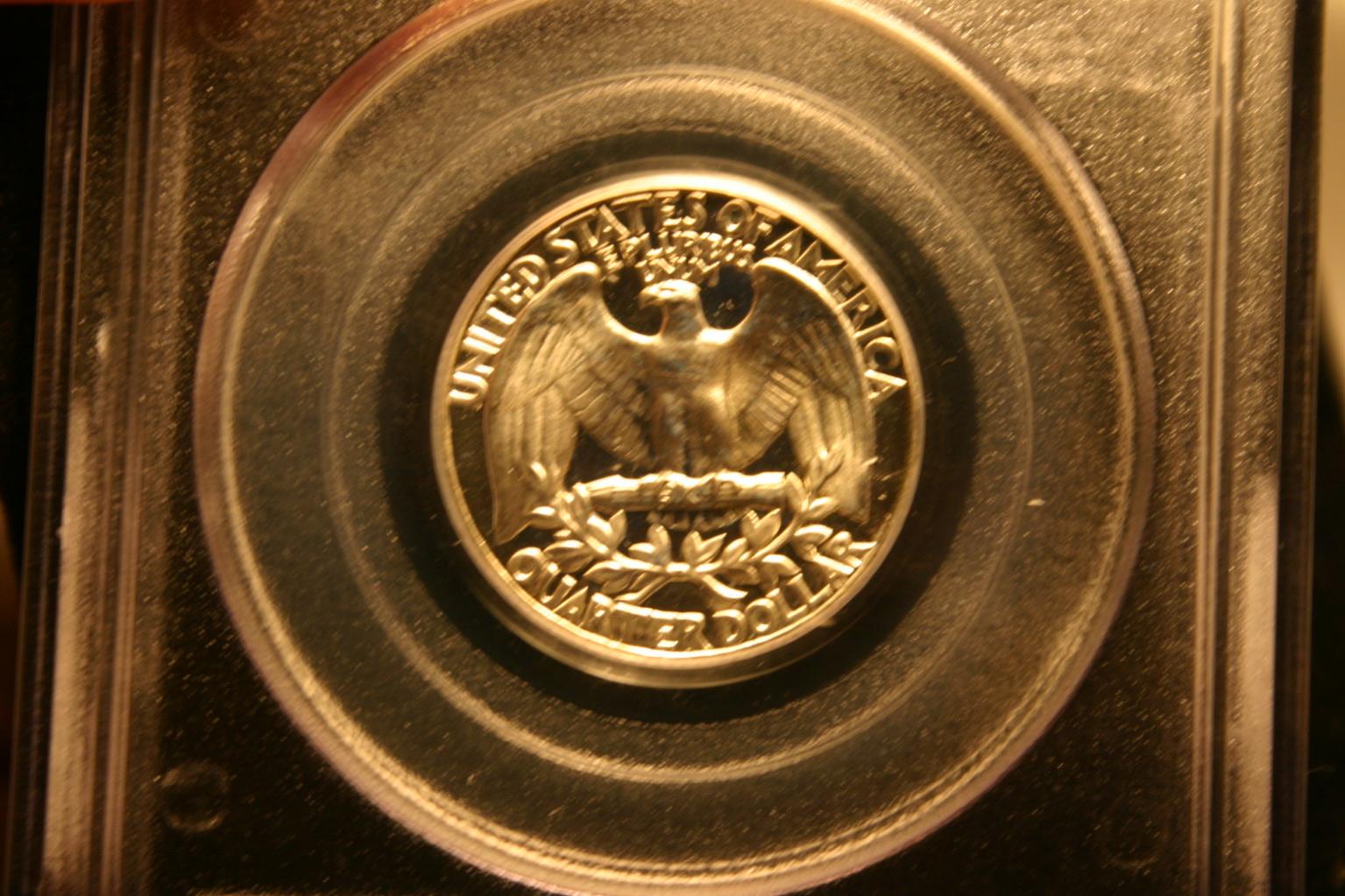 I've recently picked up my very first graded quarter. A 1954 Proof. Here it is: I've also heard different opinions about the grade, and that it why I wanted to make this thread. I am just curious what the collectors on cointalk and those who know their quarters think about what this might grade. -Kyle