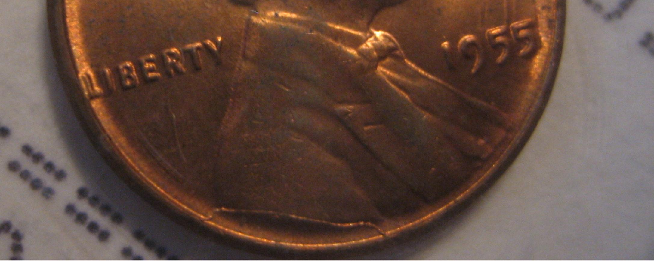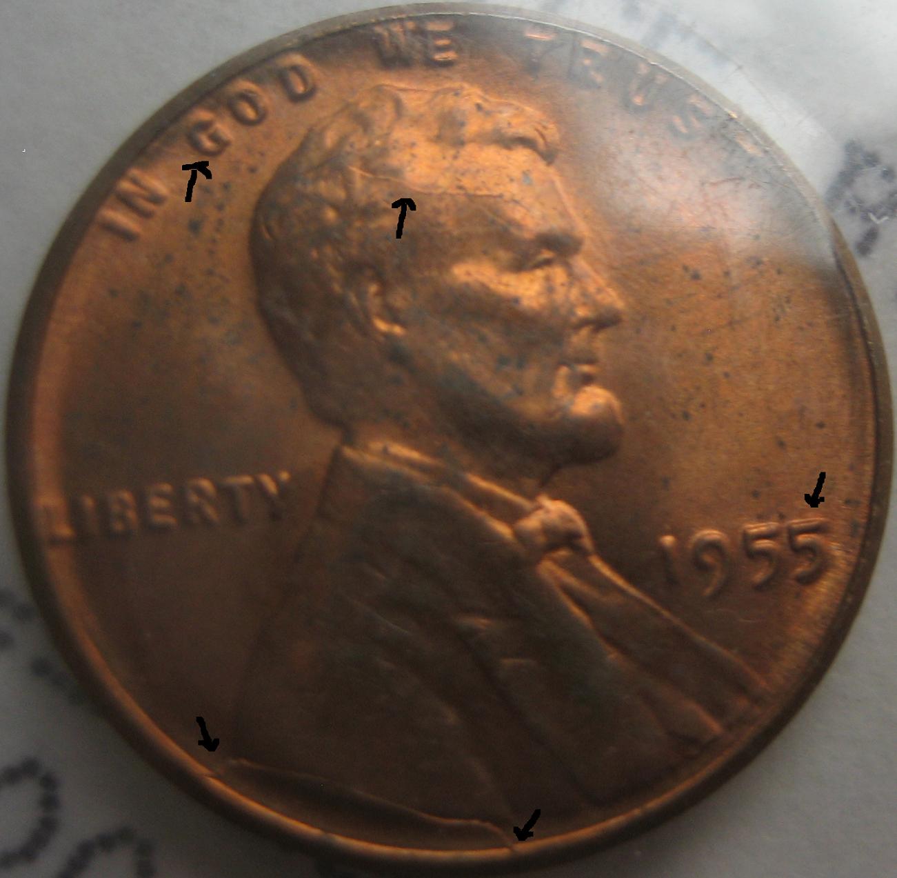 I have got this '55 cent with many errors on it, what do you think? -cracked die edge to skull area -cracked die under Lincoln -double date 55? Thanks.