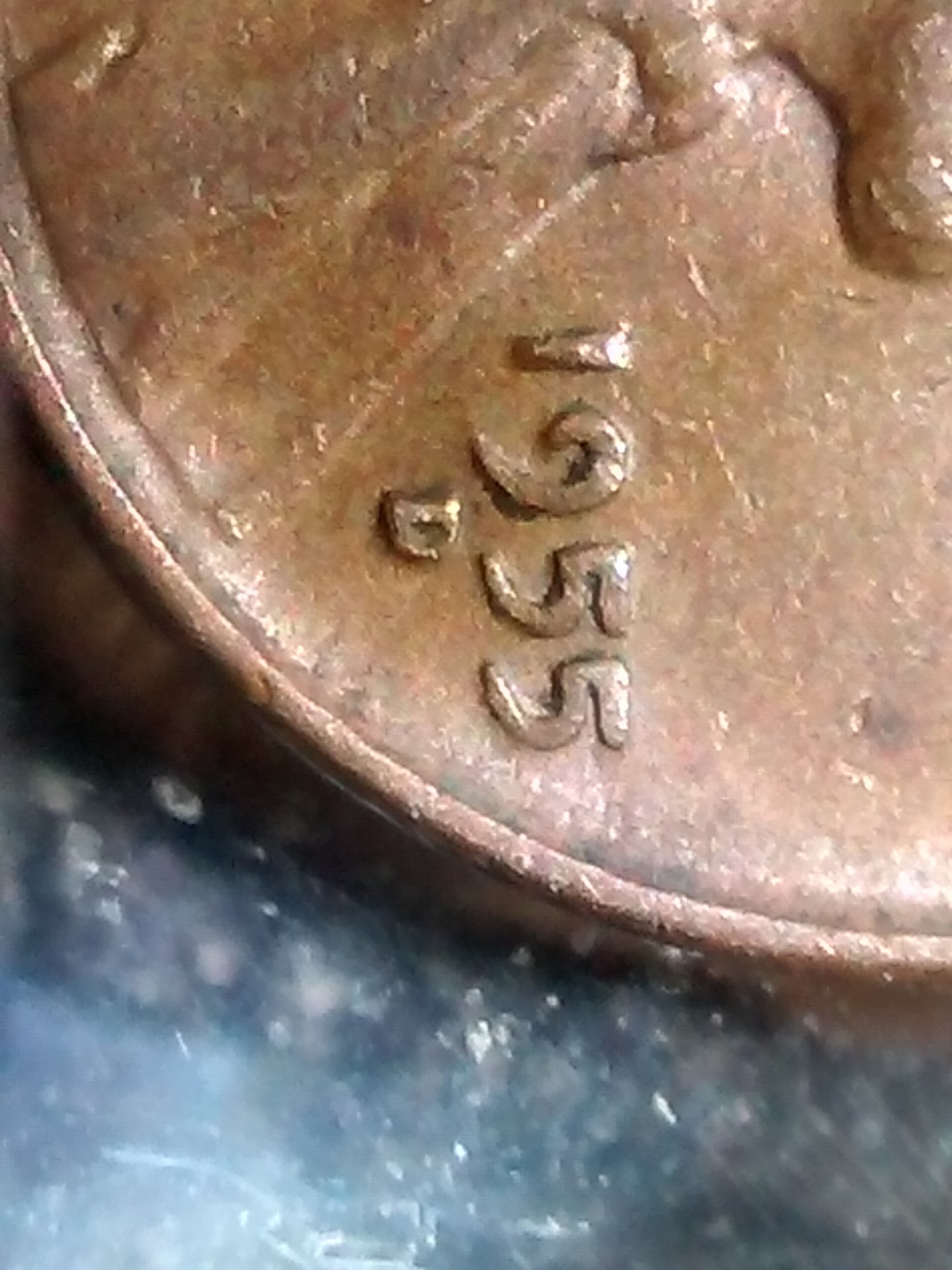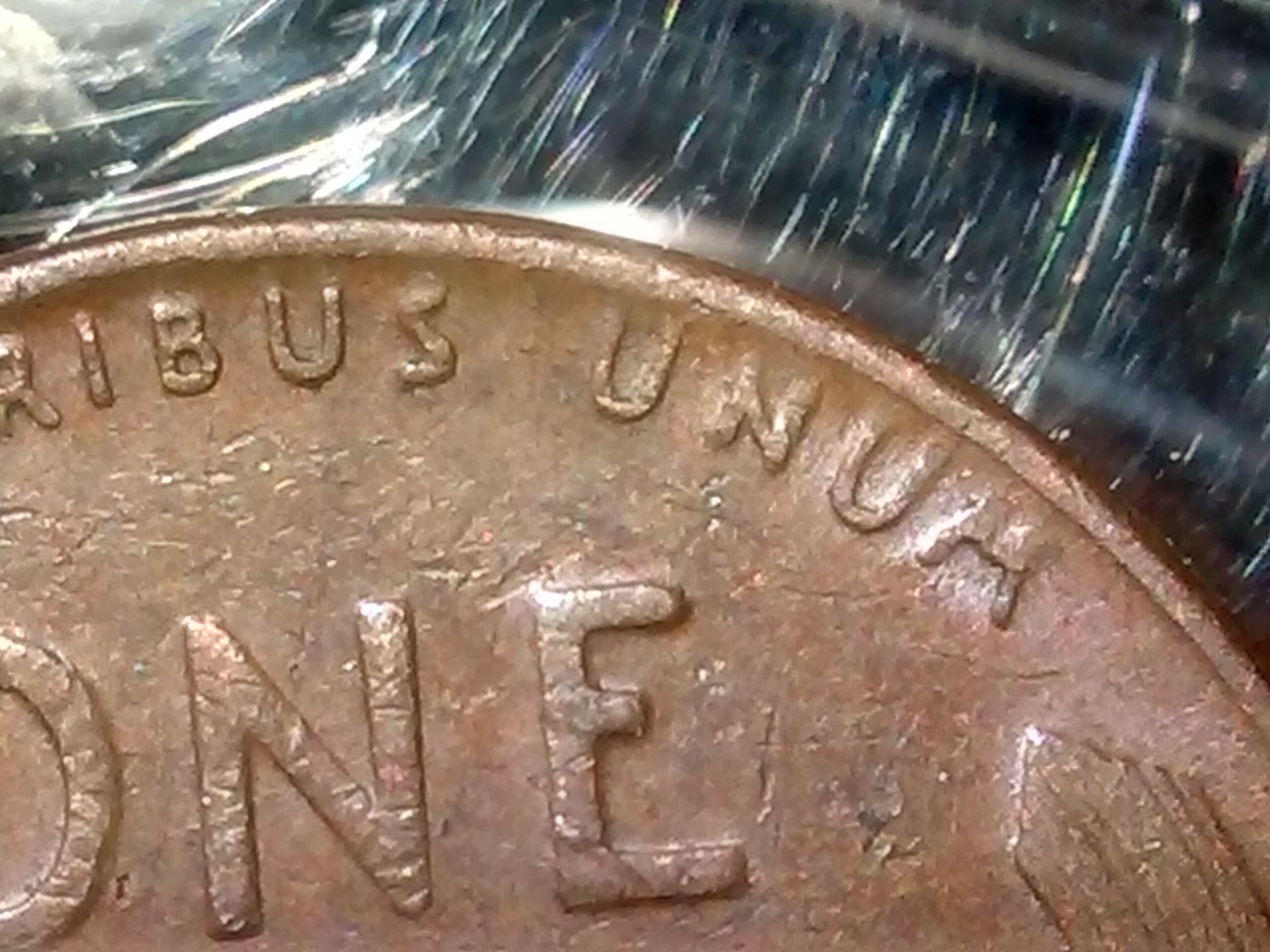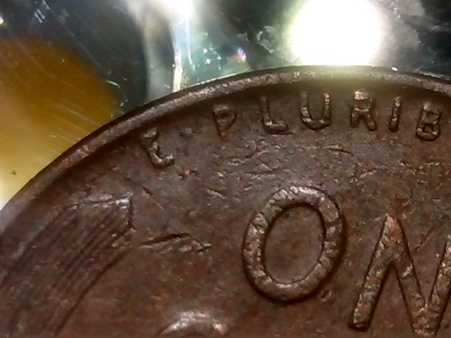 i just found this in my change. look between the E and PL. it looks like an p or an m shadow. and there appears to be slight empressions of wheat ears or scratches parrall to each other. can anyone tell me anything please