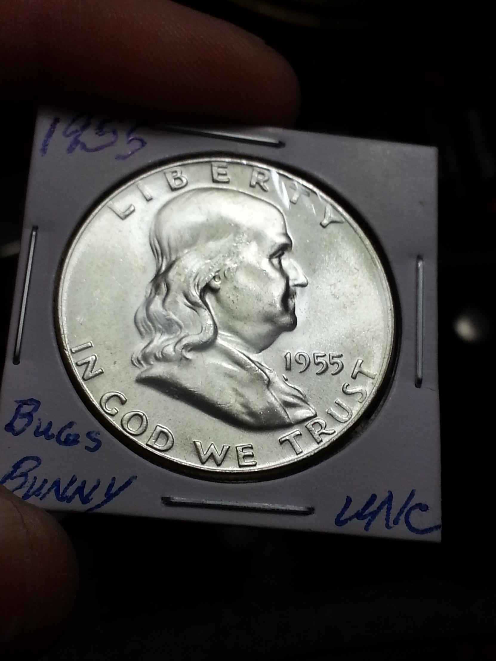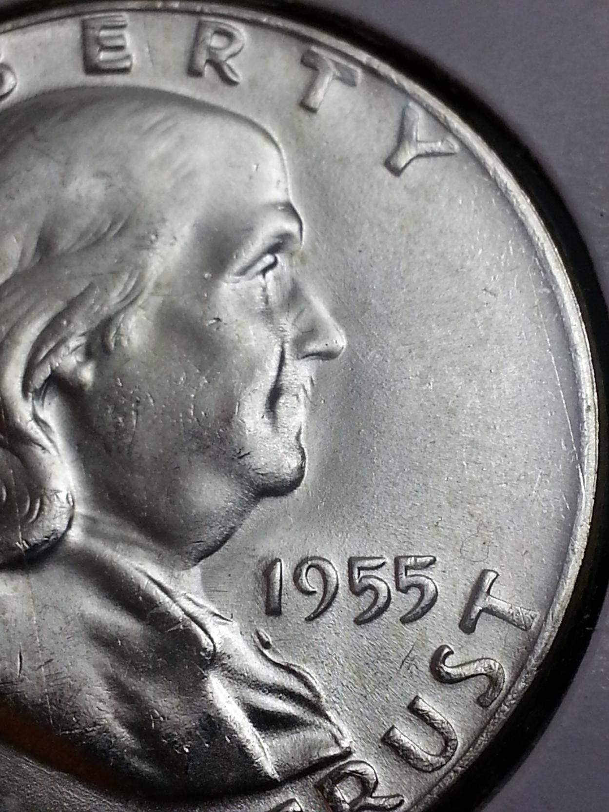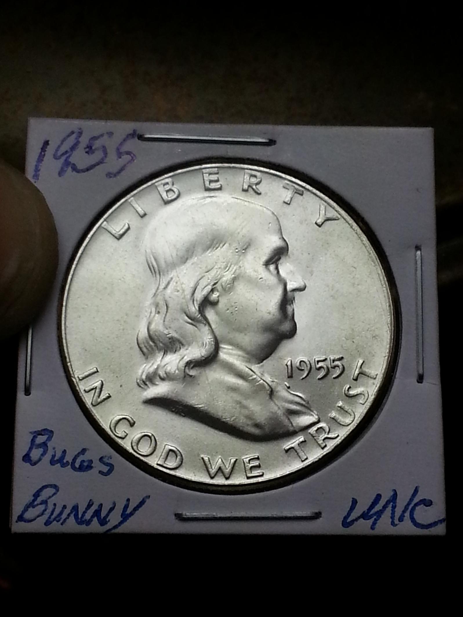 I have this 1955-P Franklin Half "Bugs Bunny" Variety that I am looking to sell. It is a beautiful coin and I really would love to hang on to it, but I am trying to raise money for my next large purchase thus I offer it here to the members of this great forum who can appreciate this rarity. Only a tiny percentage of the 1955-P population is this variety, perhaps 1% to 2% and most are low quality with considerable abrasions on the high points in addition to being weak strikes. As you can see from these pictures, this coin is BU Gem quality. Very few nicks or abrasions can be found. The coin has wonderful original luster and is clearly a Full Bell Lines example. If you are interested, please message me with your offer and I will be sure to get back to you ASAP. Paypal would be the preferred method of payment. Much thanks! O, I also have a 49-D and 50-D in BU condition so let me know if you are interested in either of these as well.