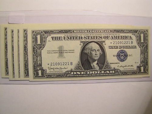 hey guys, just dropping by the paper money side to say hello! As the title says,i checked the archives and found these laying around (forgot i had them) i have 5 consecutive Silver certificate Star notes in uncirculated condition, just wondering ball park figure for single sale or obviously i would fetch a couple more dollars together. Also, should i get a seperate holder for these guys or is it ok to leave them like this? i dont have any weight sitting on them if that matters....