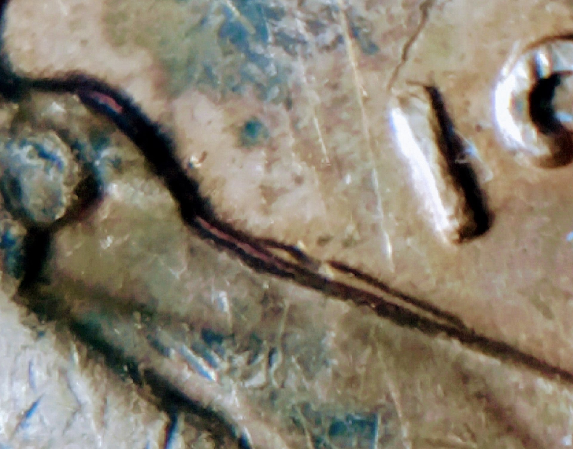 Specifically the front of vest. To the west of the date. That does not appear that way.(flat and shelf like) IMO. That's why I turn to you guys. Thanks for the reply BTW.