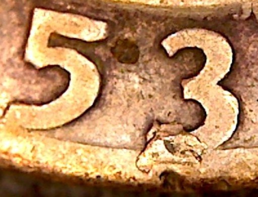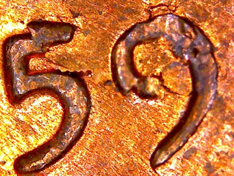 1959d cent--its hard to get a good photo of it. its peeling up above the curve of the 5 also in the 9 1953d quarter--not sure if this is anything