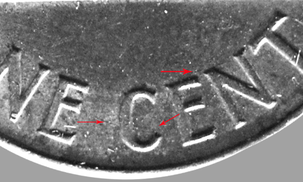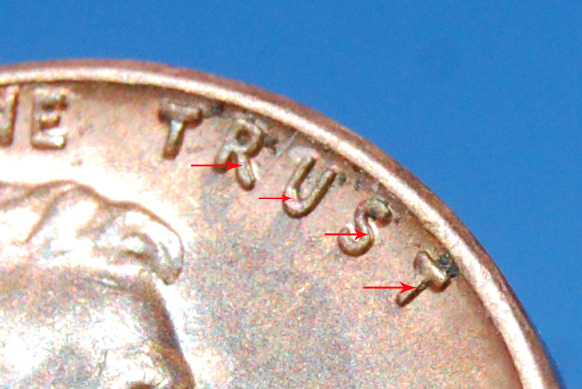 Had some better light today... 1). the date... I know it looks flat here, but it is rounded. Just couldn't get a good shot. 2). this is the die markers for the "trust" 3). I needed to put the die marker on the reverse in black and white because although I can see them, I couldn't get it to show at all in color. any thoughts??