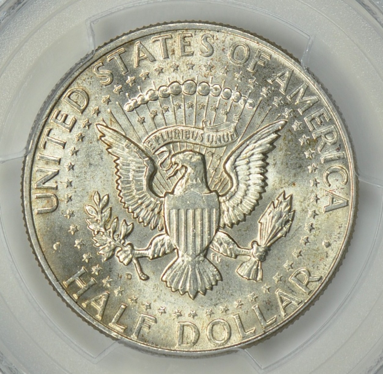 MS64 due to what looks like reed marks on the neck and poss. above the ear, but add 1 for the toning, so MS65? Also, although this is a Denver business strike (type ODV-002), the reverse appears to be the transitional die pairing with RDV-001 (reverse w/broken stars & straight G). I only know about this since I started to sort through a whole bag of Kennedy half dollars of my dad's recently (not done). I have two of the 1964-D with nice toning and the broken star/straight G reverses.