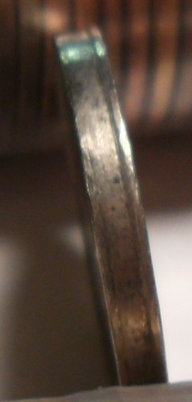 It looks like the raised part is on both sides and the indent is in the middle of the edge. The die collar is wider than that, so I think this coin may have been machined (post strike).