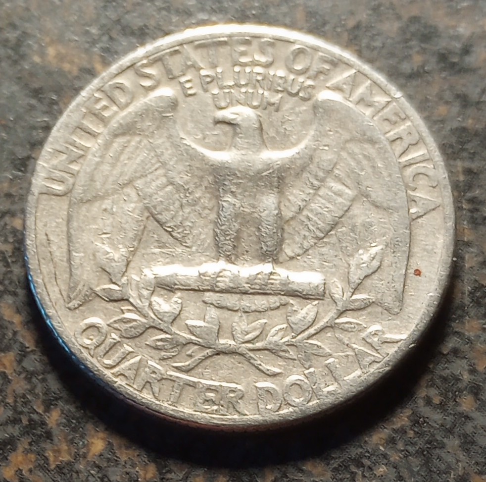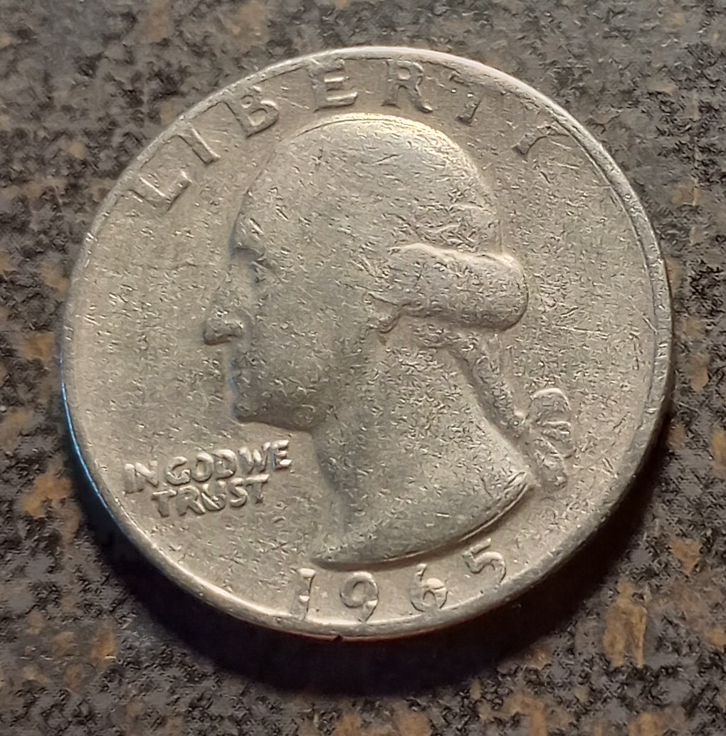 1965 Washington quarter. Help me out, look at Washington's ear is that doubled? I don't think there is any 1965 with a DD ear. Looks like a curls underneath possibly a hit. And what's at the bottom of the bus looks like separation but it continues all the way down almost to the end thanks people